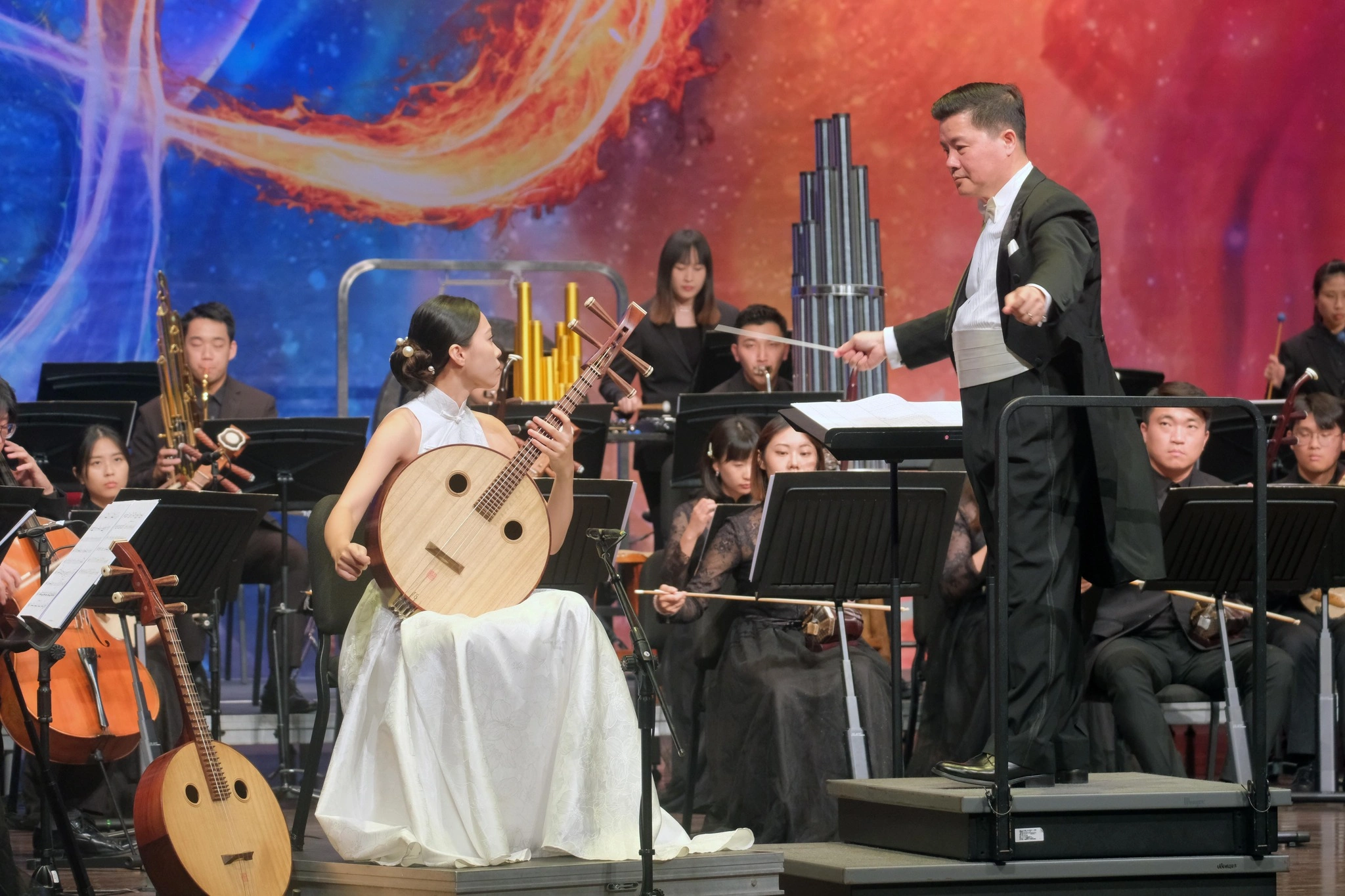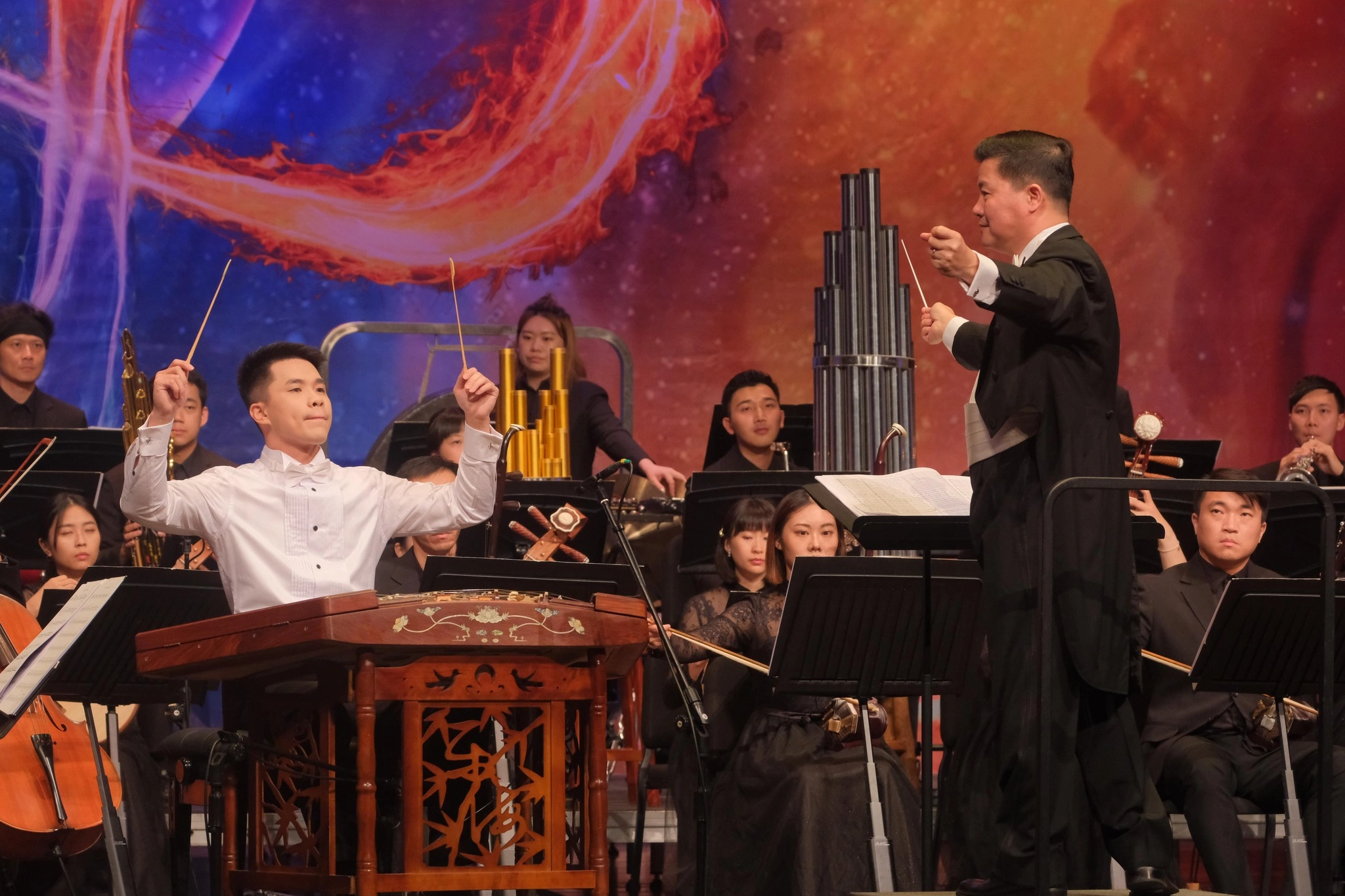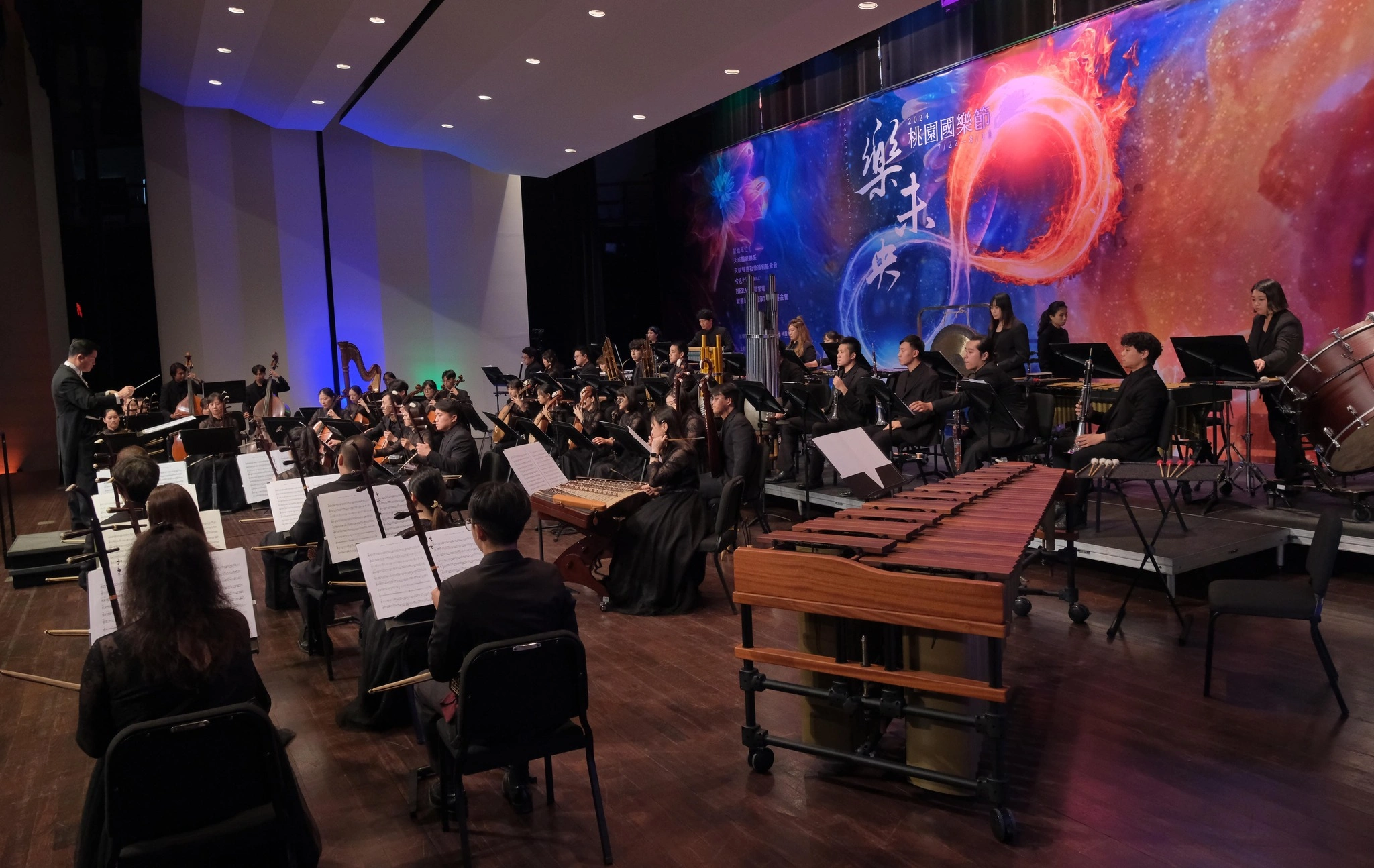 桃園國樂節長期深耕國樂專業、傳承教育、創新元素,累積許多專業能量,成為桃園重要的音樂活動之一,許多愛好國樂的朋友們都遠道而來參與這場年度盛會,今天開幕音樂會以「繁星璀璨」為主題,由桃園市國樂團精心規劃,呼應各地亮眼之星匯集到今日的閃耀舞台上,邀請臺南藝術大學教授-安敬業指揮與臺北市立國樂團嗩吶演奏家-劉庭倩、臺南市民族管絃樂團揚琴演奏家-林永源、台灣戲曲學院優秀中阮演奏家-高珮瑜以及桃園市福豐國中國樂藝才班學生-文中、日本鶴翔二胡樂團等等,不僅齊聚台灣各國樂團、學校的佼佼者,更有日本團隊相互交流演出,展現國樂豐富面貌,且充滿演奏能量與充沛活力,讓現場觀眾滿載而歸。