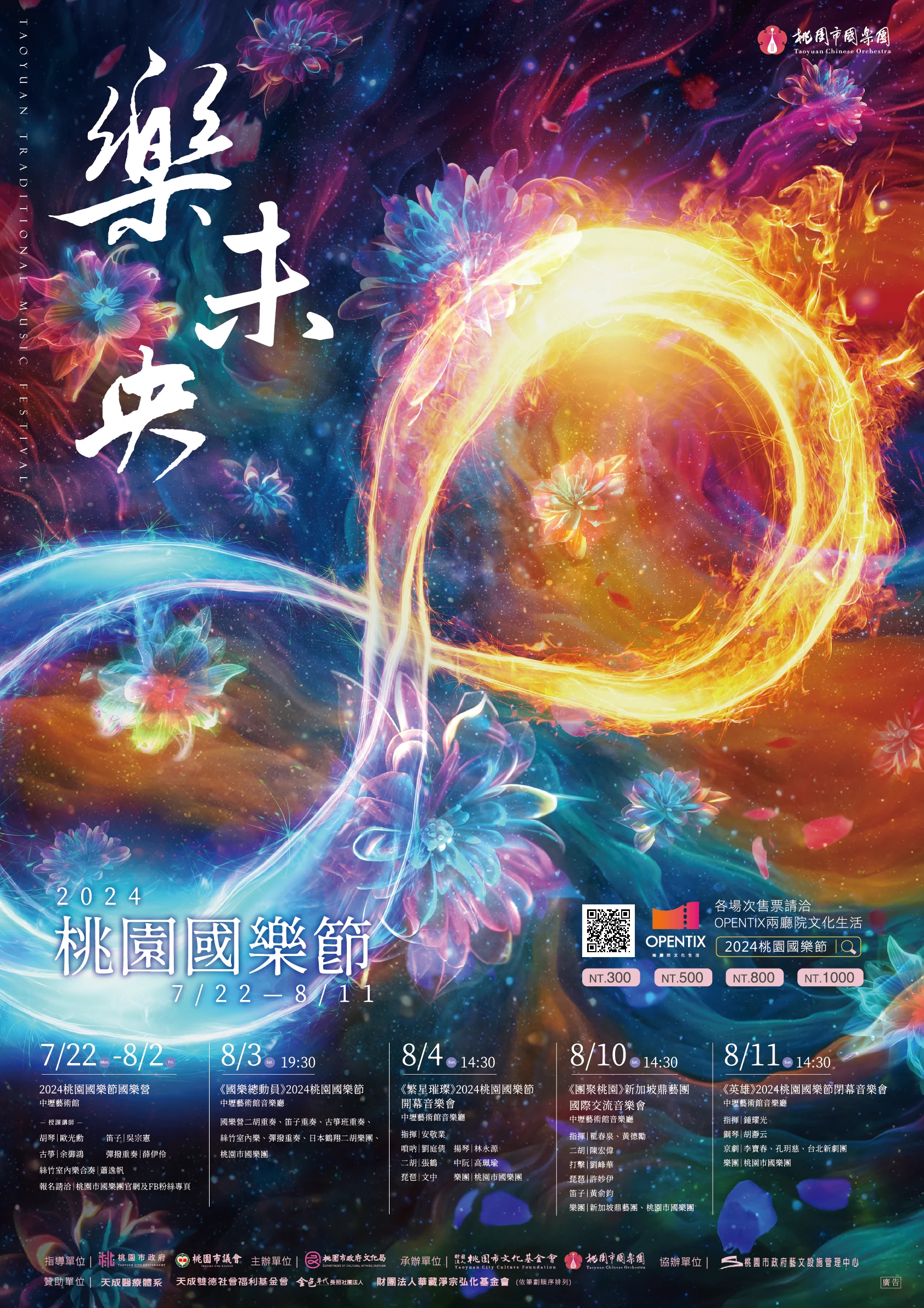 音樂會將在8月3日起由「國樂總動員」之中的笛子、胡琴、古箏大師班及桃園市國樂團優秀師資集訓後登場演出,並邀請日本鶴翔二胡樂團同場交流;8月4日開幕音樂會「繁星璀璨」由指揮安敬業帶領「臺灣國樂青年音樂家繁星計畫優秀音樂家」分別來自臺北市立國樂團嗩吶演奏家-劉庭倩、臺南市民族管絃樂團揚琴演奏家-林永源等多位音樂家齊聚,璀璨舞台;8月10日「團聚桃園」新加坡鼎藝團國際交流音樂會,由瞿春泉、黃德勵聯手打造精彩曲風,選曲以兩地作曲家描述優美風情,展現南洋、台灣、桃園不同風情,洋溢著異國的國樂佳曲;8月11日「英雄」閉幕音樂會,由縱橫中西樂名指揮家鍾耀光精采詮釋,音樂會中由首位獲得以色列「魯賓斯坦國際鋼琴大賽」最高獎及最具觀眾人緣獎雙料得主鋼琴家-胡瀞云演繹鋼琴協奏曲《赤壁》,下半場則為知名文武老生-李寶春帶領的台北新劇團、絕美旦角孔玥慈共同呈現京劇《霸王別姬》,穿梭古今,激盪出精彩樣貌,精彩可期。