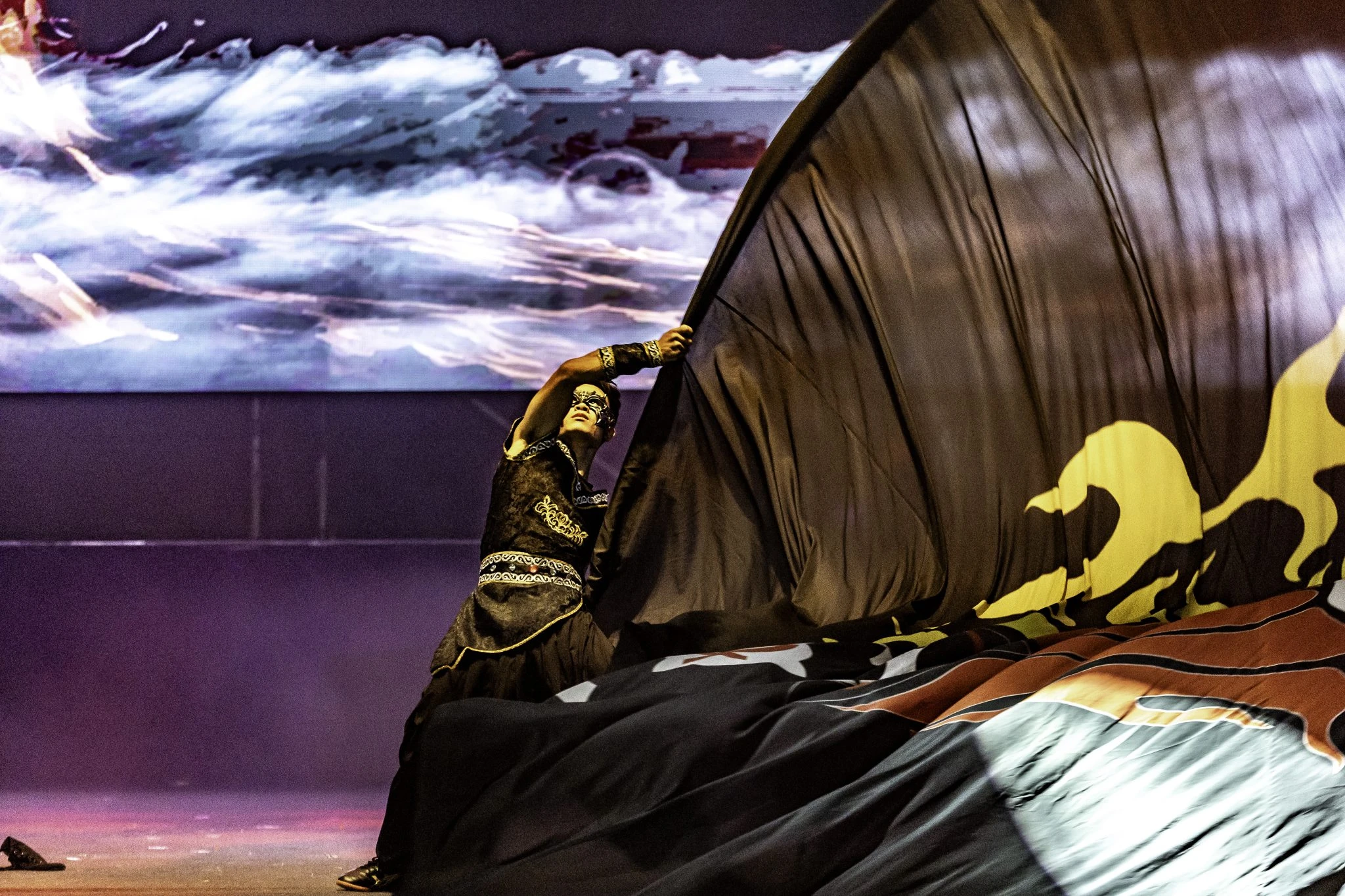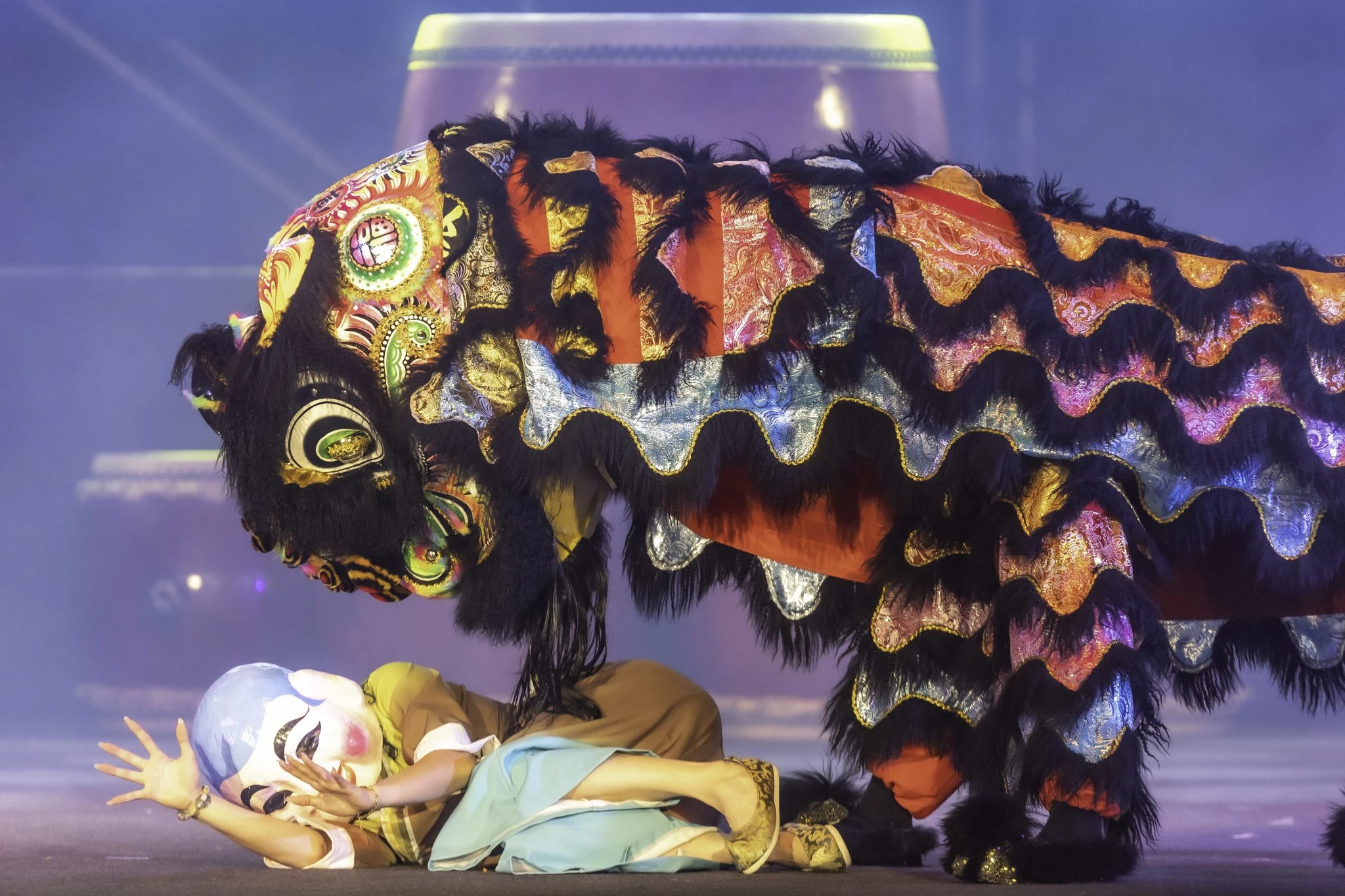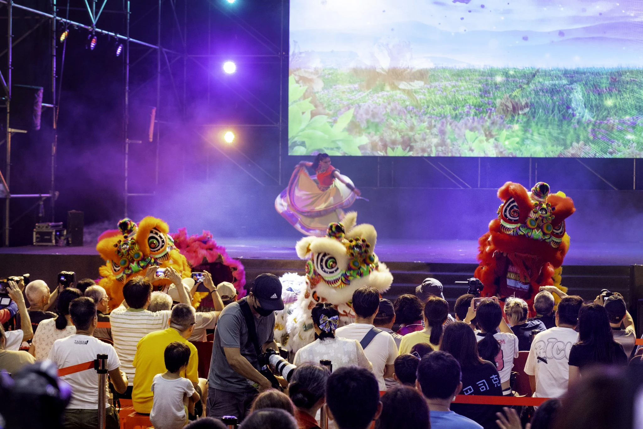 舞台上,震動胸腔的鼓音率先開場,獅陣踏著氣勢非凡的步伐登場,武術、現代舞、舞大旗與現場音樂依序交織,透過燈光與投影的虛實層次,構築出如夢似幻的視覺空間。節目編排緊湊、節奏明快,讓人從頭到尾目不轉睛,每個片段的節奏張力十足。中場休息時更安排土地公民俗趣味問答,主持人與觀眾互動熱絡,輕鬆愉快的氛圍讓整場演出更添親切感。