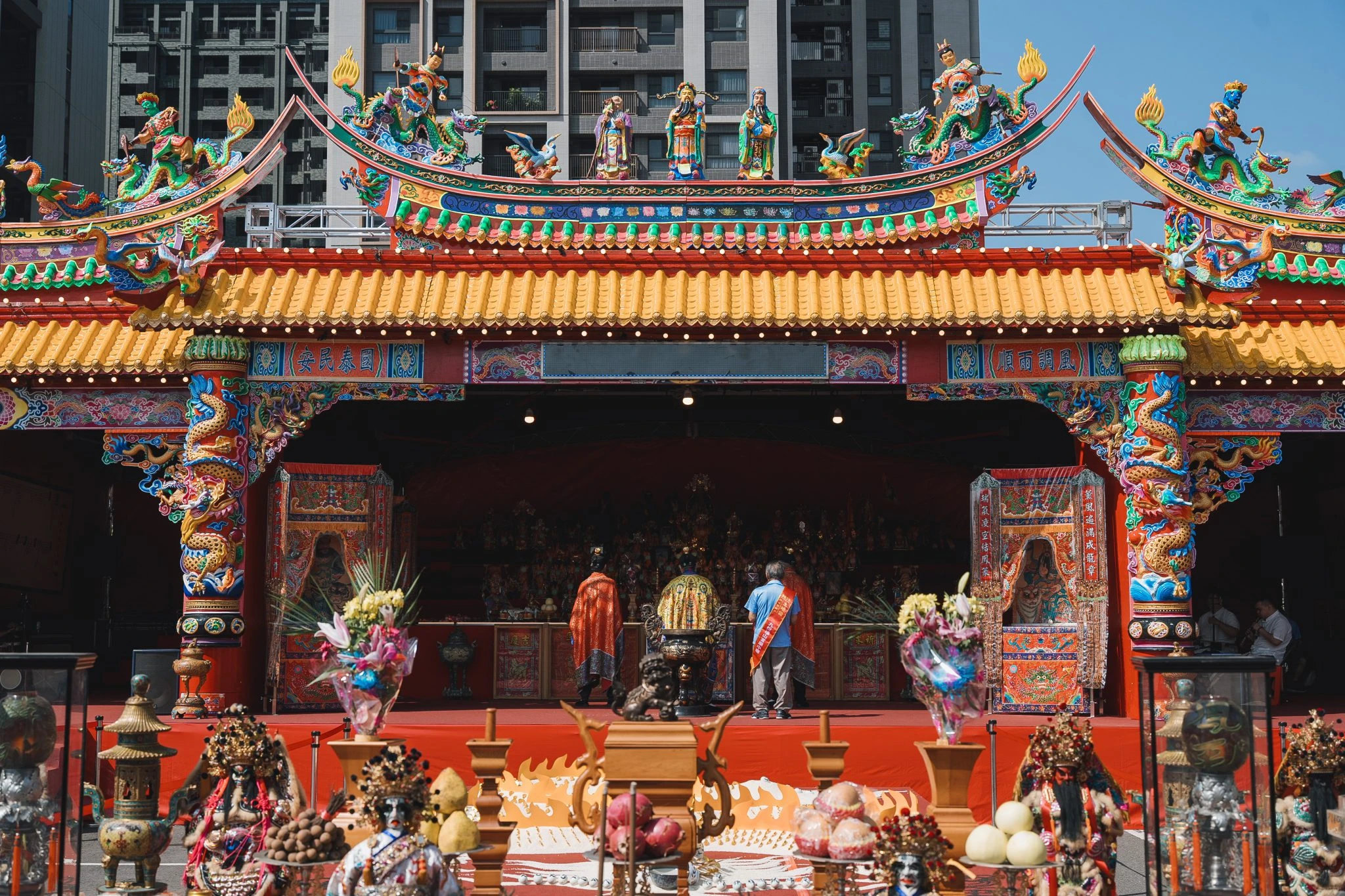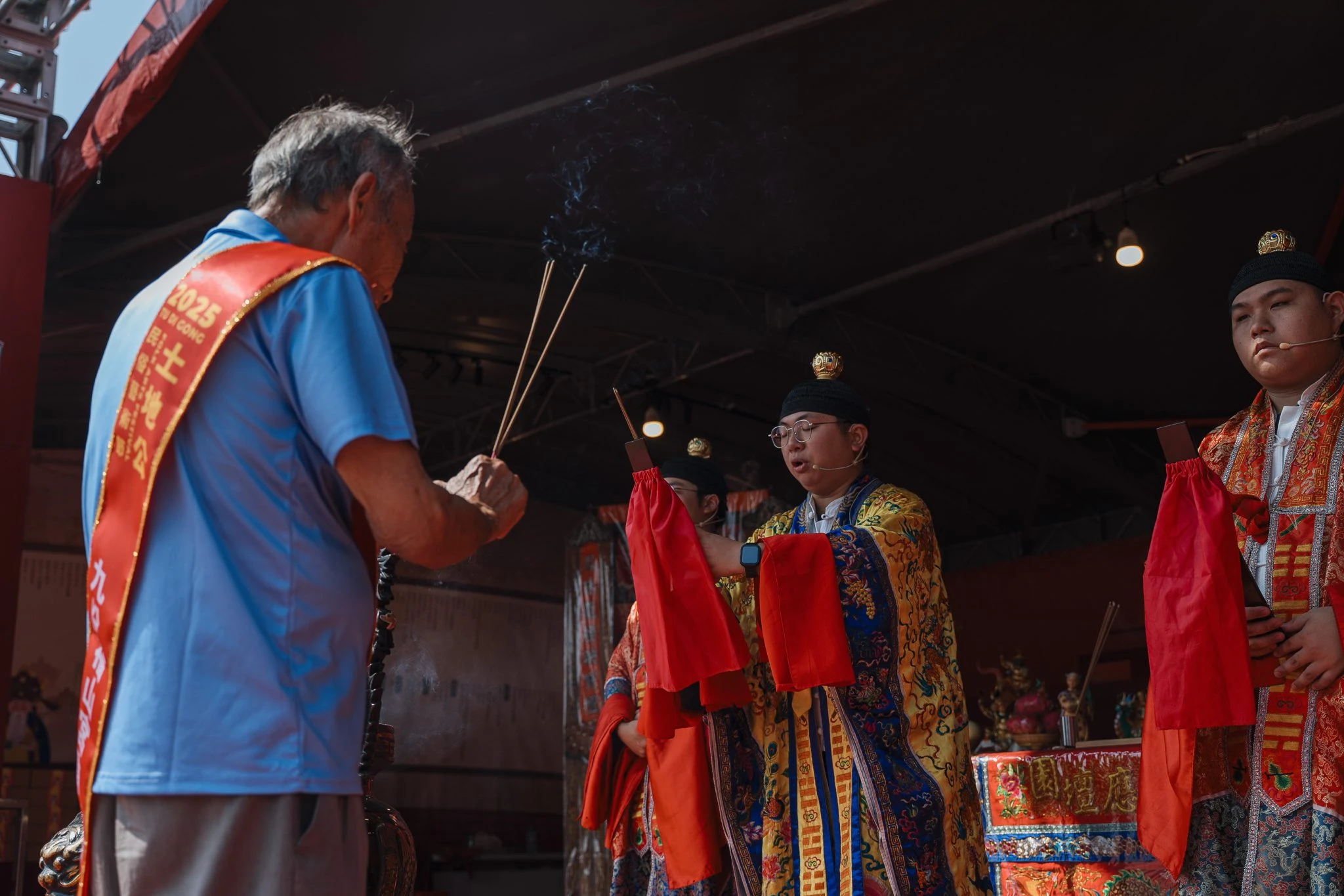 土地公們駐駕於紅壇,由道長主持三獻法會,藉此為神尊增添靈力,護駕人員同霑法喜。法會啟始之時,樂聲奏起鈞天。