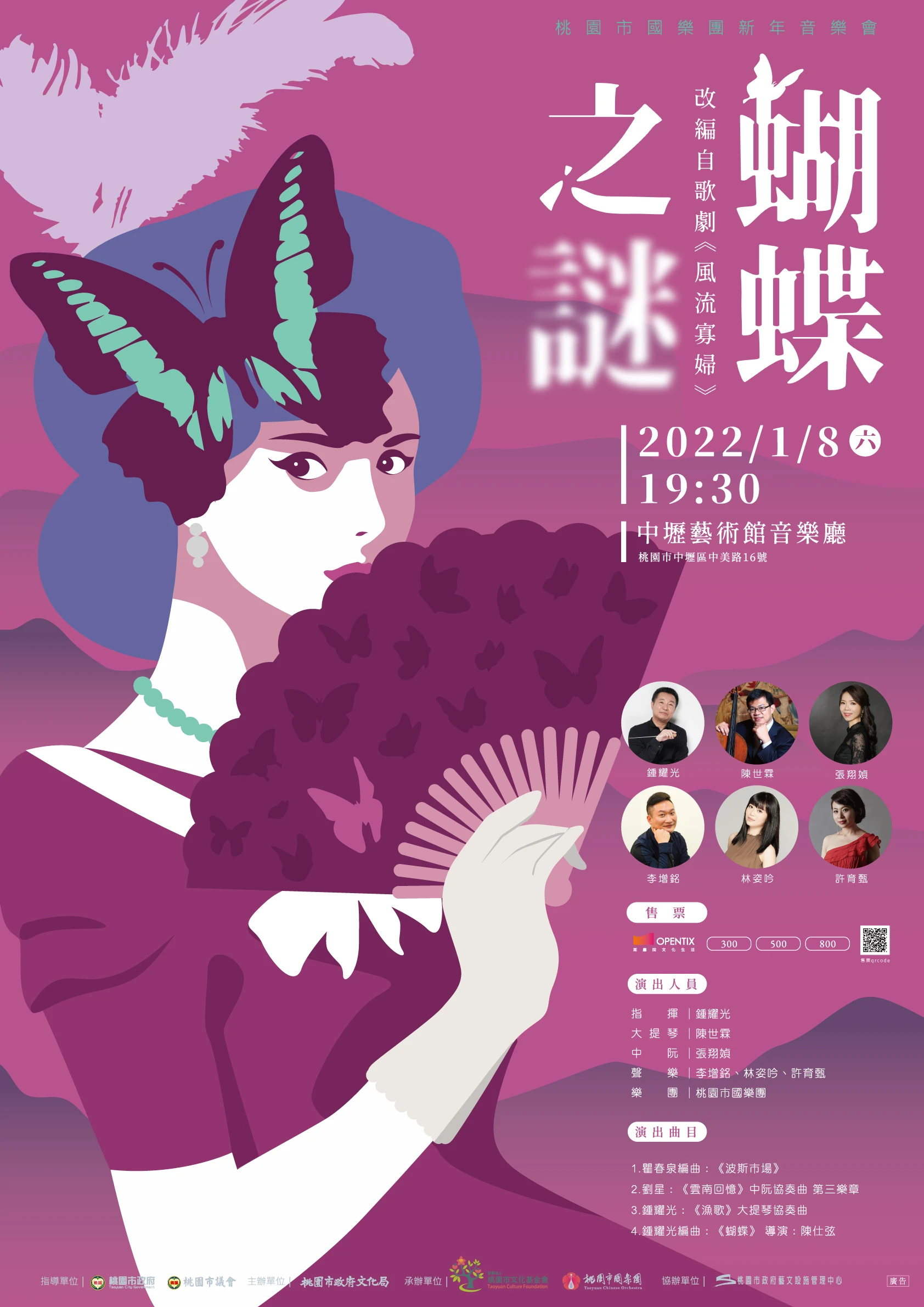 新的一年特邀導演陳仕弦-改編自歌劇《風流寡婦》,由鍾耀光全新編曲《蝴蝶》結合國樂之美,並攜手聲樂家李增銘、林姿吟、許育甄一同帶領觀眾共同刻劃一場高潮迭起的音樂會,體會音樂帶給您的感動之餘,開啟您的觀察力,找出「蝴蝶」的線索,解開音樂會的關鍵之謎!