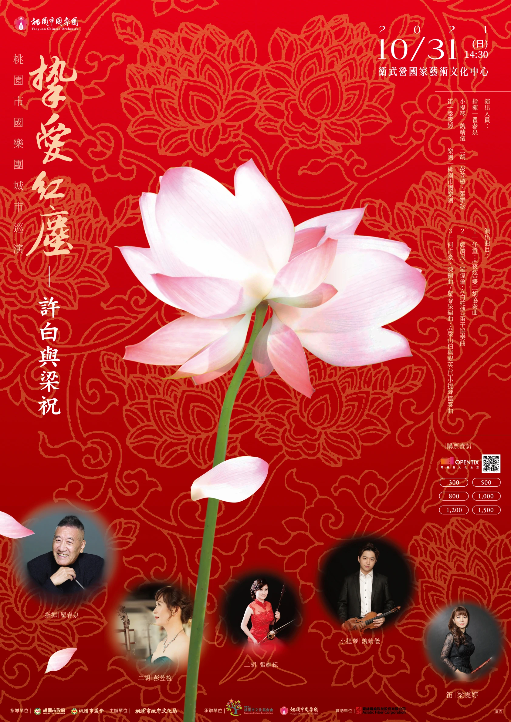 《摯愛紅塵》-許白與梁祝音樂會將許仙與白素貞、梁山伯與祝英台的故事搬至大螢幕,特邀國際知名指揮家瞿春泉攜手伊莉莎白女王國際音樂大賽桂冠得主小提琴演奏家魏靖儀詮釋經典作品《梁山伯與祝英台》小提琴協奏曲;知名笛子演奏家梁雯婷精湛演繹民間傳說《白蛇傳》;高雄市國樂團首席彭苙榳、桃園市國樂團首席張維紜聯手打造雙二胡協奏曲《夜炫》,詮釋跨世代的情感篇章,10月31日邀您與桃園市國樂團一起讓愛奔放