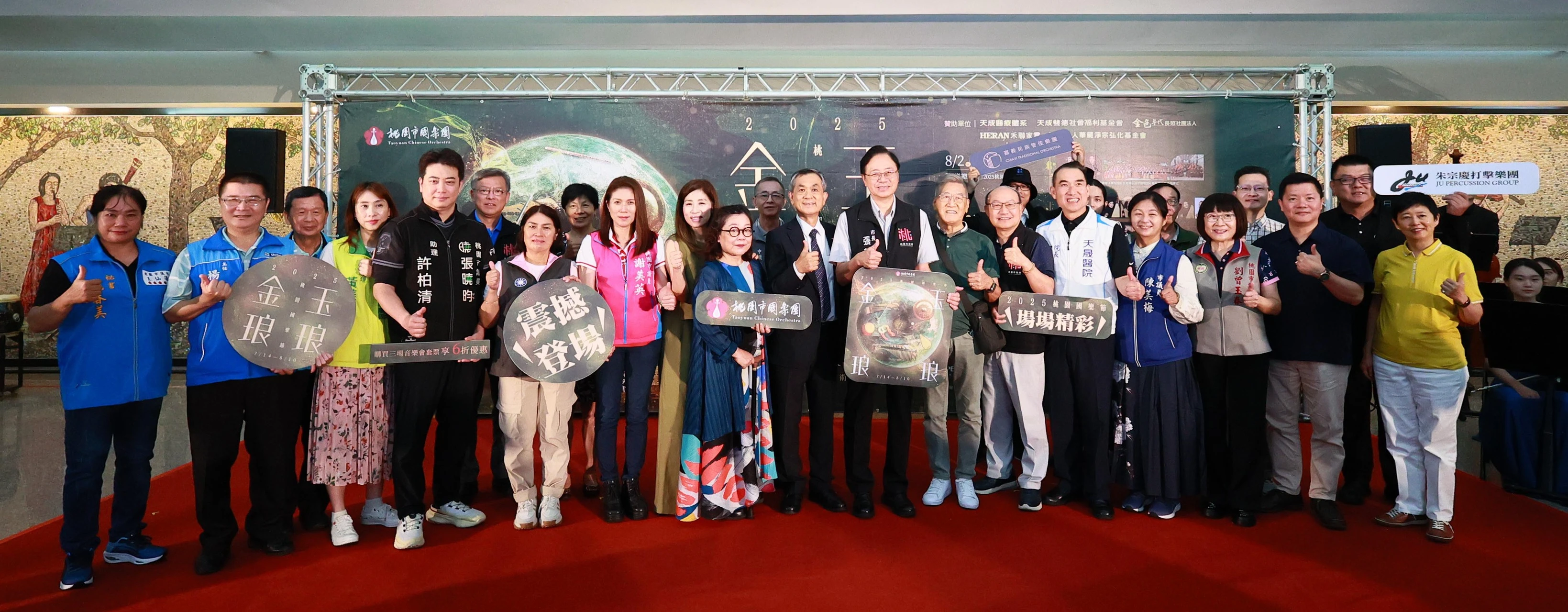 今日記者會參與貴賓包括桃園市市長張善政、市議員舒翠玲、陳美梅、王仙蓮、劉曾玉春、謝美英、桃園市政府文化局長邱正生、中壢區長李日強、中壢區新街里里長莊金泉、忠貞國小校長魏秀蓮、禾聯碩股份有限公司總經理林欽宏及天成醫療集團院長鄭貴麟、桃園市立委邱若華主任楊翊堂、市議員張曉昀助理許柏清、吳嘉和秘書劉國華、黃崇真助理黃美伶、桃園市國樂團團長林子鈺、首席指揮瞿春泉、指揮張佳韻、安敬業、朱宗慶打擊樂團副團長黃堃儼、御樂古箏樂團藝術總監余御鴻、臺北市立國樂團琵琶首席鄭聞欣、高雄市國樂團琵琶演奏家莊雪曼、臺南市民族管絃樂團琵琶演奏家劉昀臻等均一同出席。