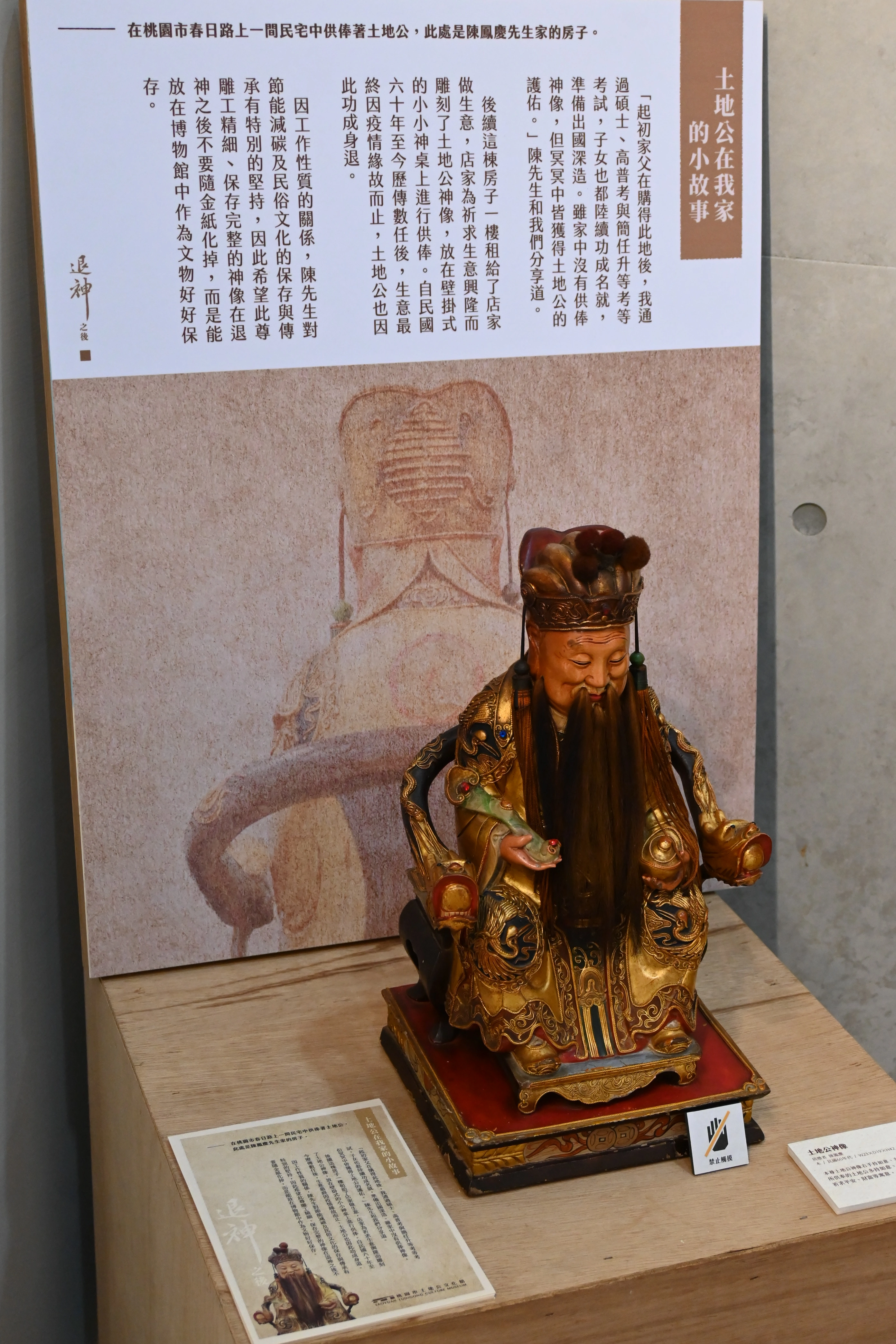 本次特展將以土地公文化館的藏品及民眾所捐贈之土地公神像、祭祀文物為主軸,梳理神像作為宗教文物、民俗工藝及無形文化資產的載體,從開光入神到退神之後的脈絡與歷程,在這當中也闡述著地方人民與土地豐富多元的故事與文化。而除了實體物件的展出,部分展品將結合簡易數位互動,呈現展品中較為細部的圖樣以及補充的小知識,讓民眾能透過更多元與趣味方式了解土地公祭祀文化。