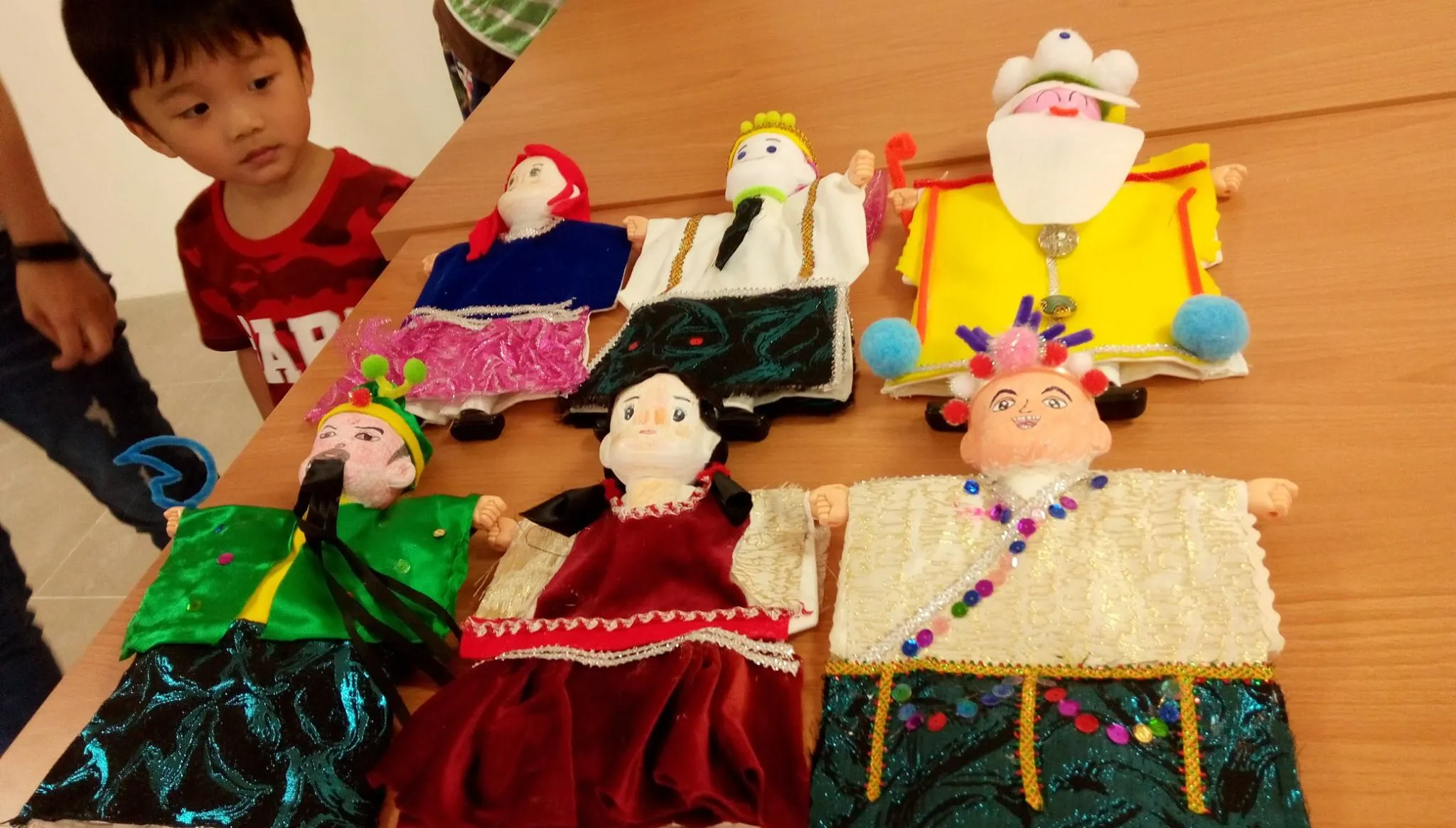 課程現場提供每人一尊素胚戲偶、十種以上的布料、數種彩繪用品、以及豐富多元的裝飾配件供孩子們自由取用。學習不同的材料和工具的認識與使用,無論從美學或材料的應用都是一個好的學習機會。