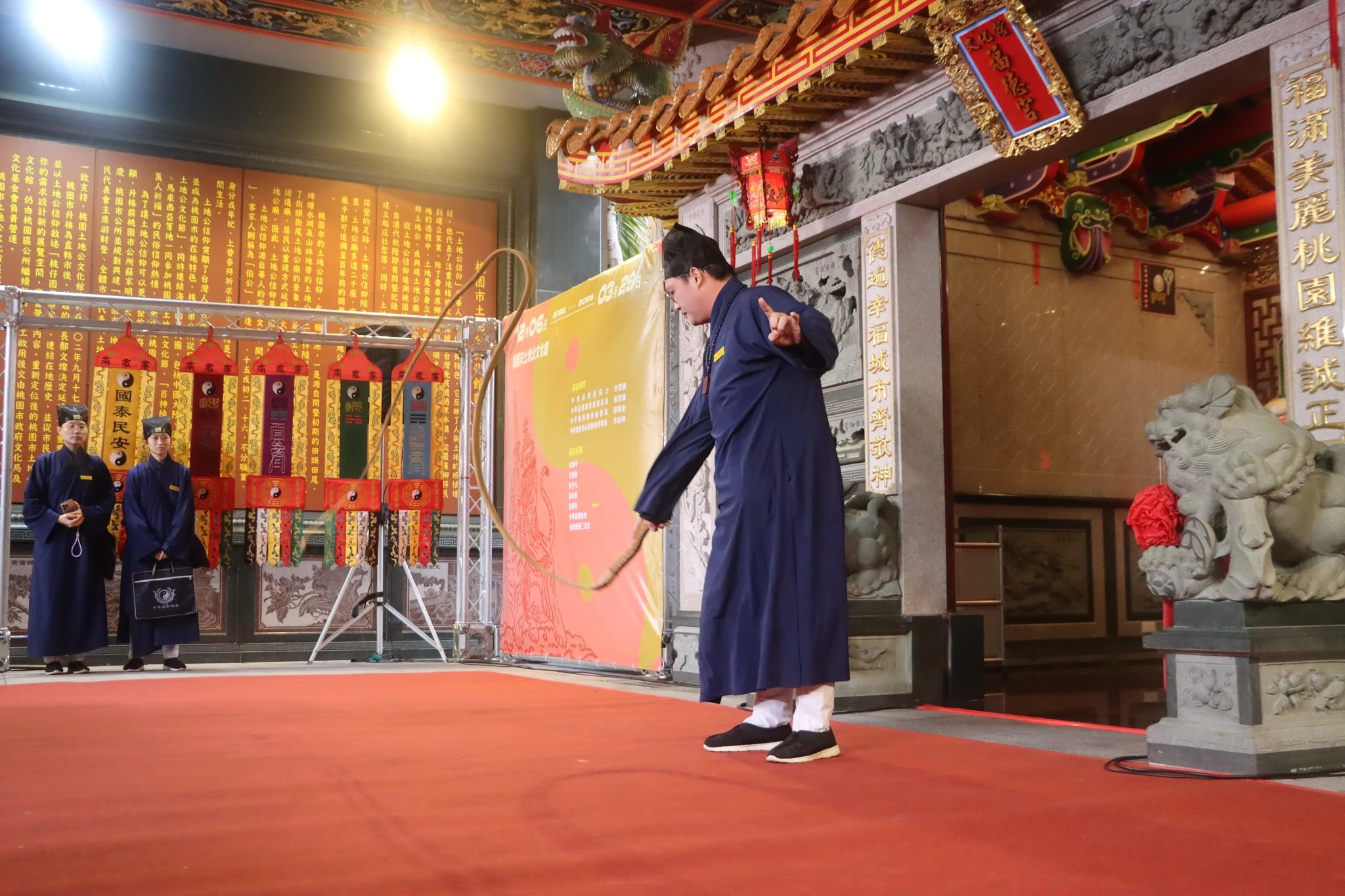 由中華道教總會青年委員會的陳重佑道長來打「法索」,為展區帶來清淨與庇佑。
