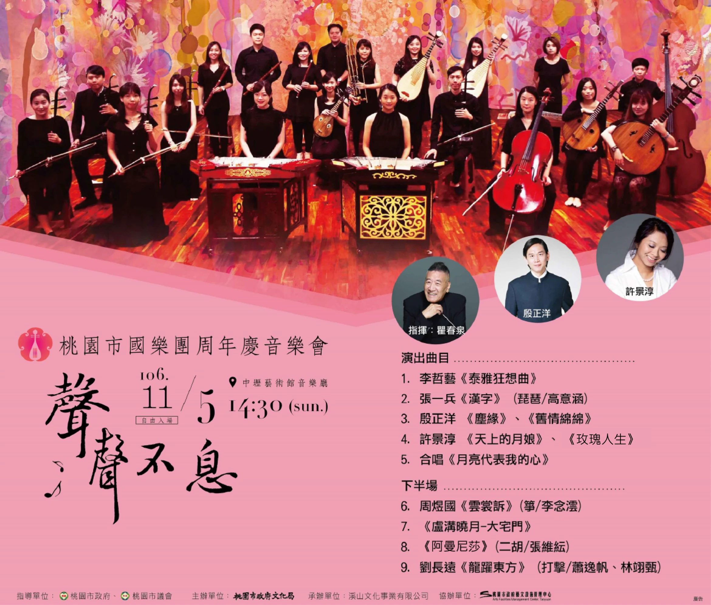 桃園市國樂團成立周年慶,壓軸盛會《聲聲不息》音樂會,將於 11月5日下午兩點半,在中壢藝術館熱鬧登場,邀請國際知名指揮家瞿春泉帶領桃園市國樂團、歌手許景淳及殷正洋演出精彩曲目,並將首演委託金曲獎得主李哲藝老師、專為桃園創作的《泰雅狂想曲》,展現桃園豐沛的音樂能量。本次音樂會由瞿春泉擔任指揮,其音樂風格溫煦,嚴謹自然,以善於結合地方的音樂特性著稱。