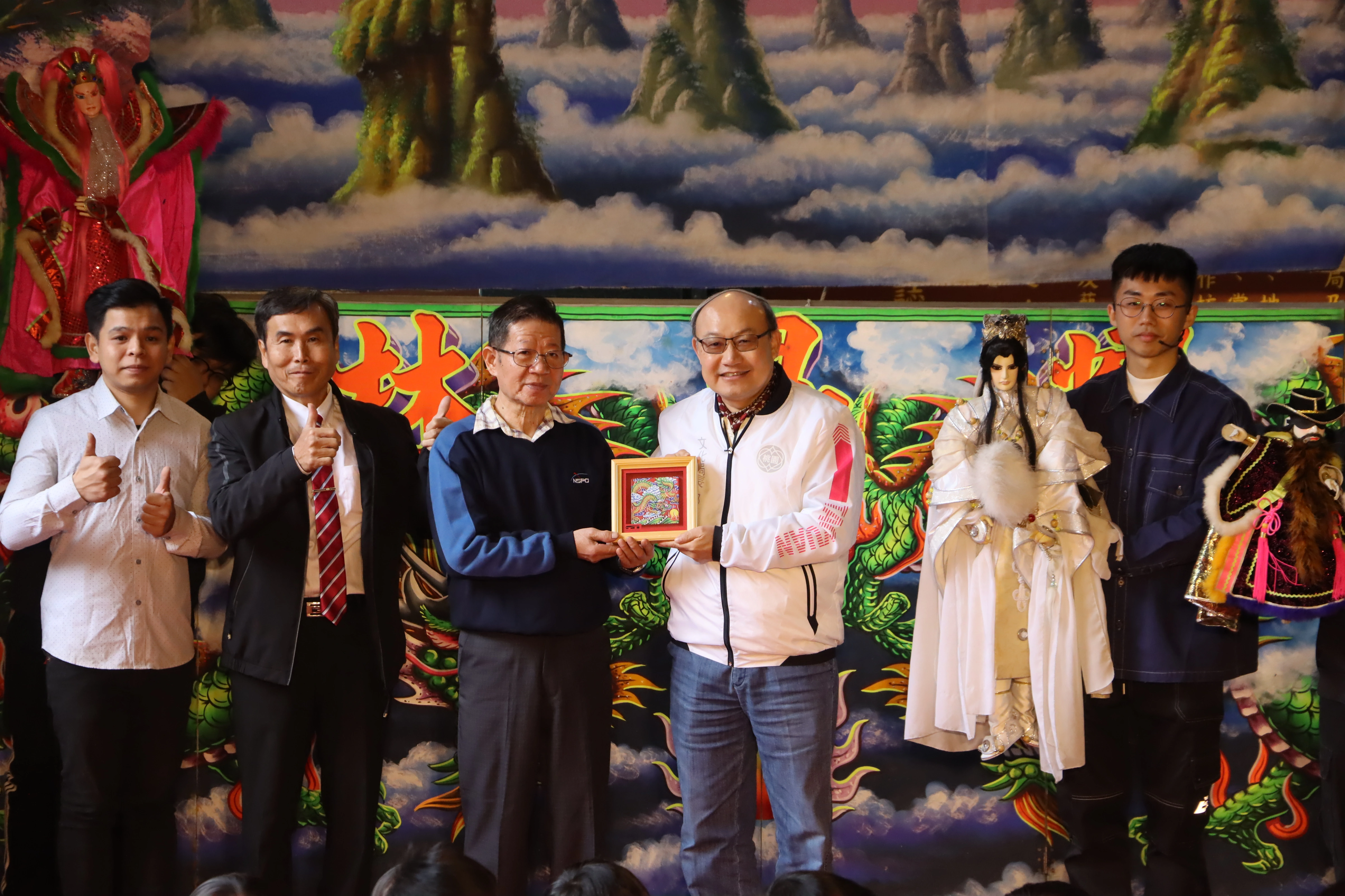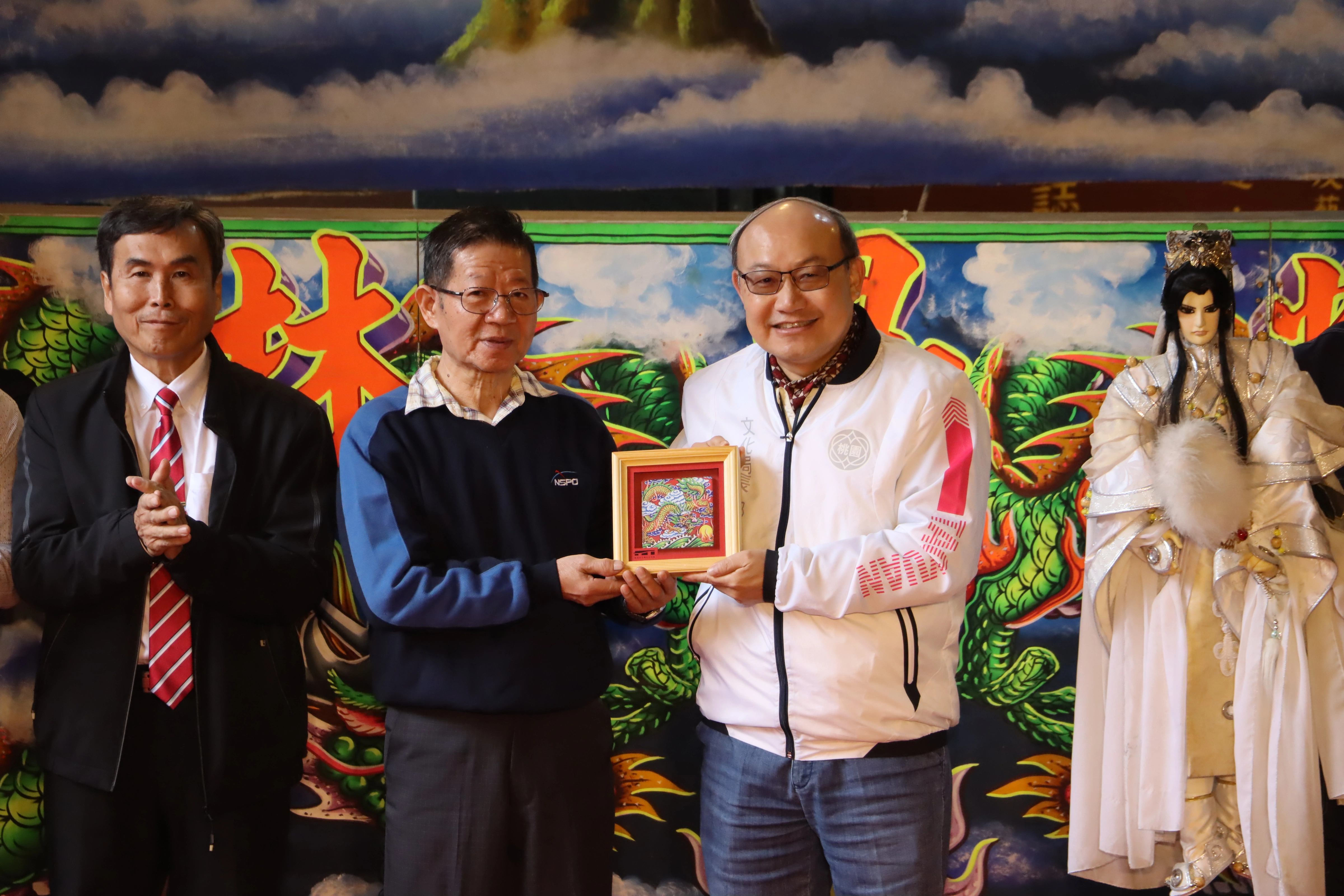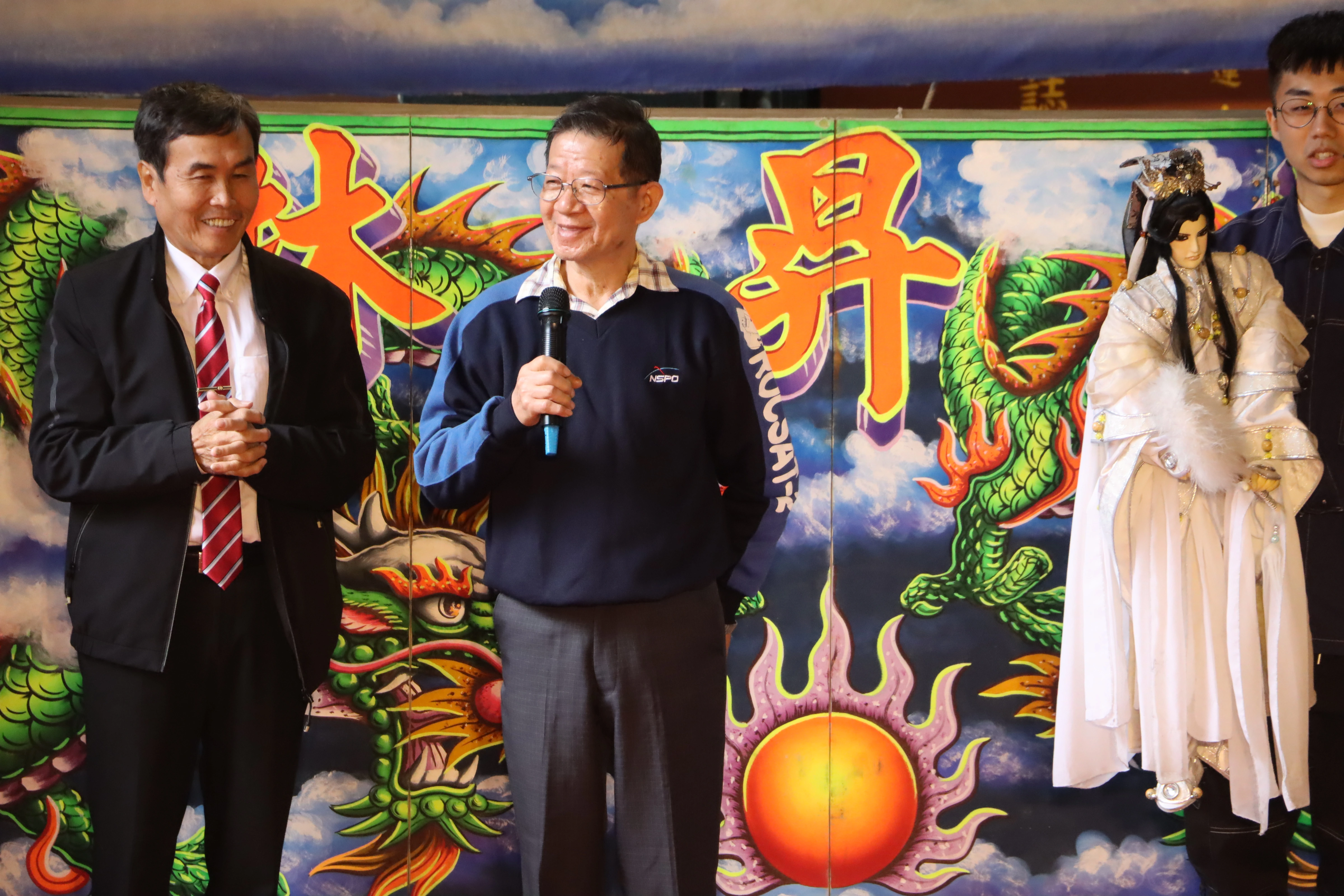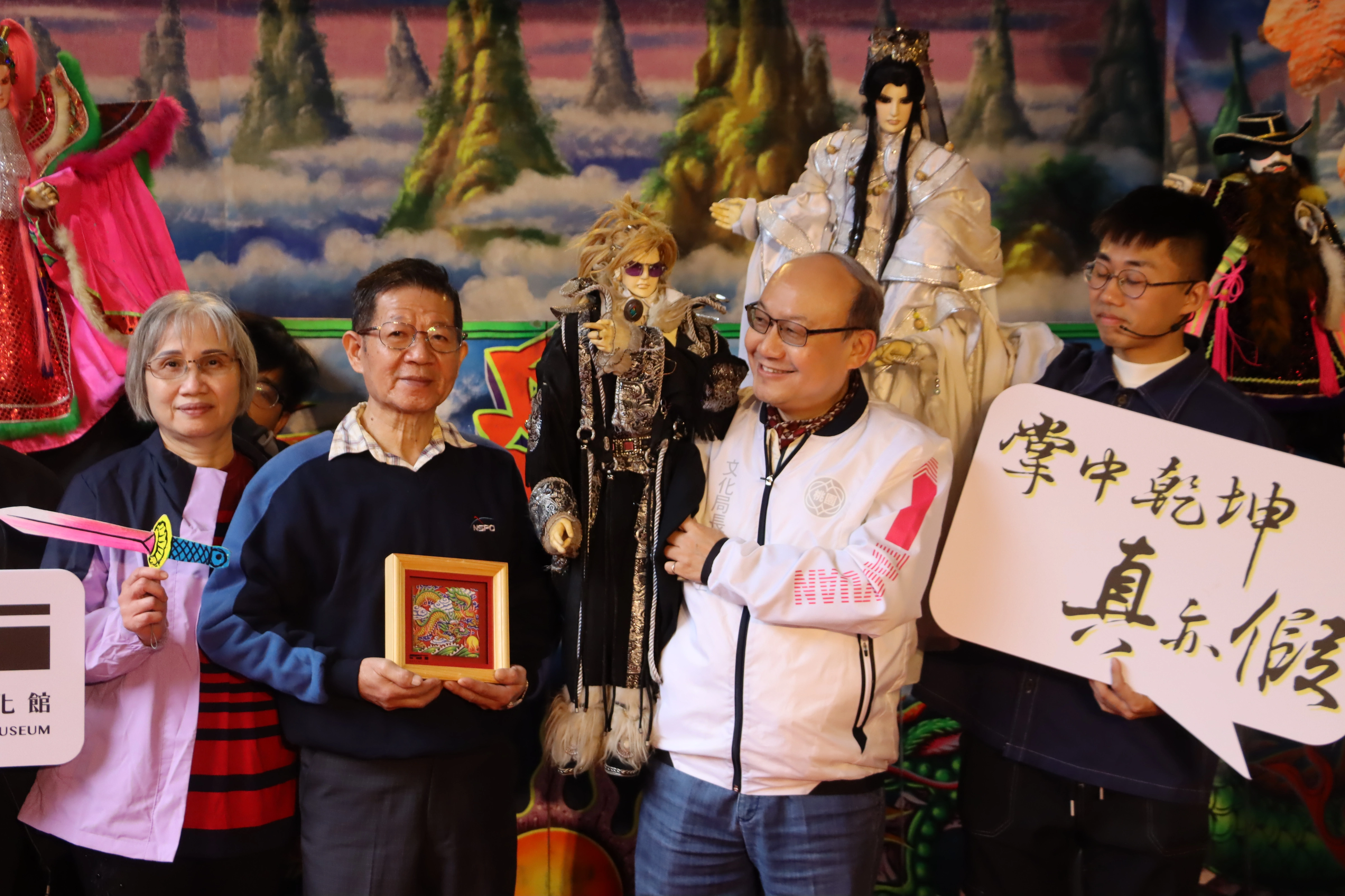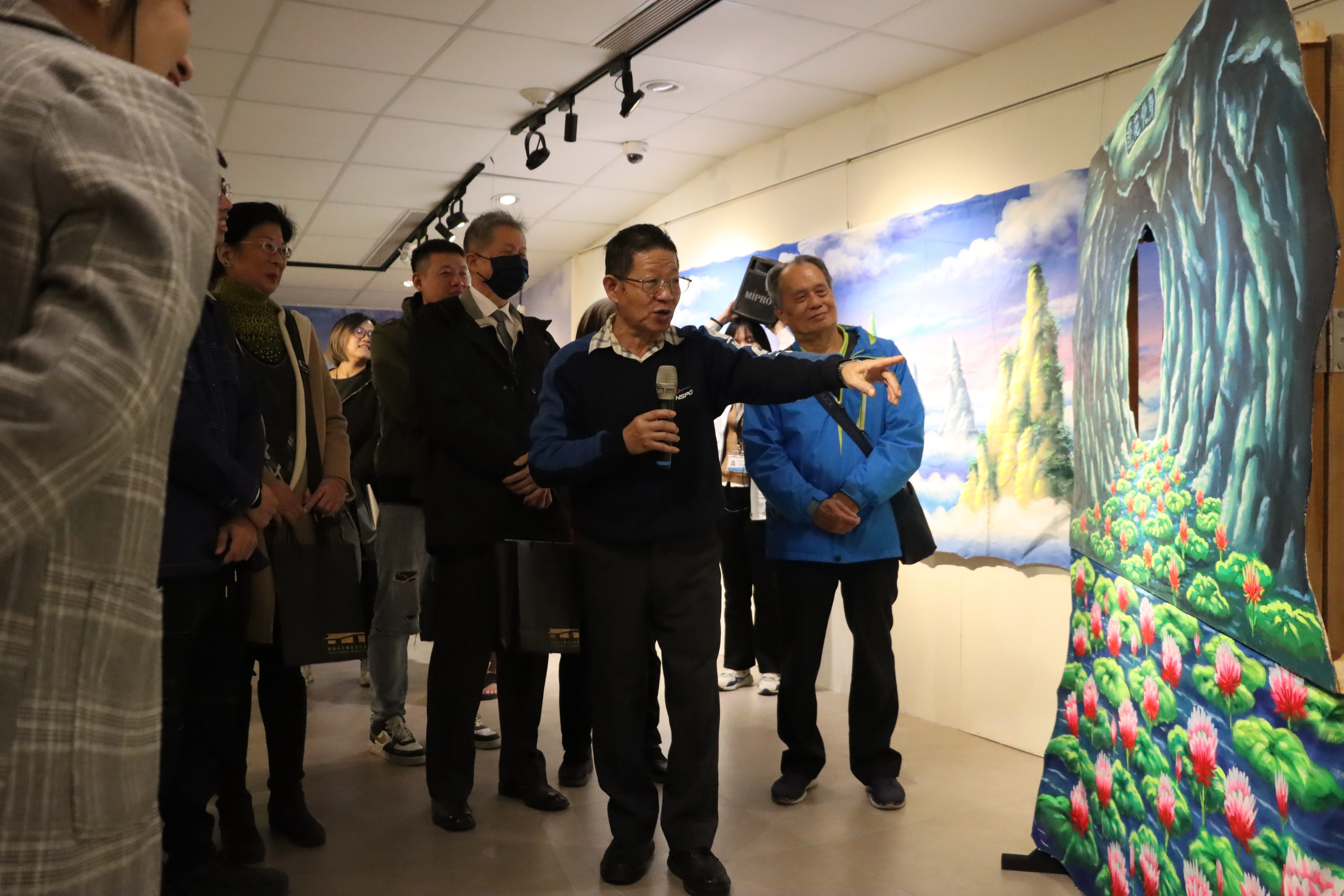 12/17下午兩點,在土地公文化館廟埕舉辦的盛大開幕記者會,邀請到隆興閣掌中劇團、泰興樂掌中藝術團、日日大掌中木偶劇團、新世界第五掌中劇團等四大劇團同台拚場,輩分最高的隆興閣掌中劇團廖昭堂團長壓軸口白請出明男師跟現場媒體說話,明男師靦腆說道:「佈景是劇團的門面,恰如其分的背後佈景更能襯托劇情的張力,在演師靈巧的指動中加上震撼力的口白,使觀眾的思緒完全被劇情所牽引,而佈景的製作,除了自己的靈感外,更要了解劇情的內涵,才能達到整體效果。」