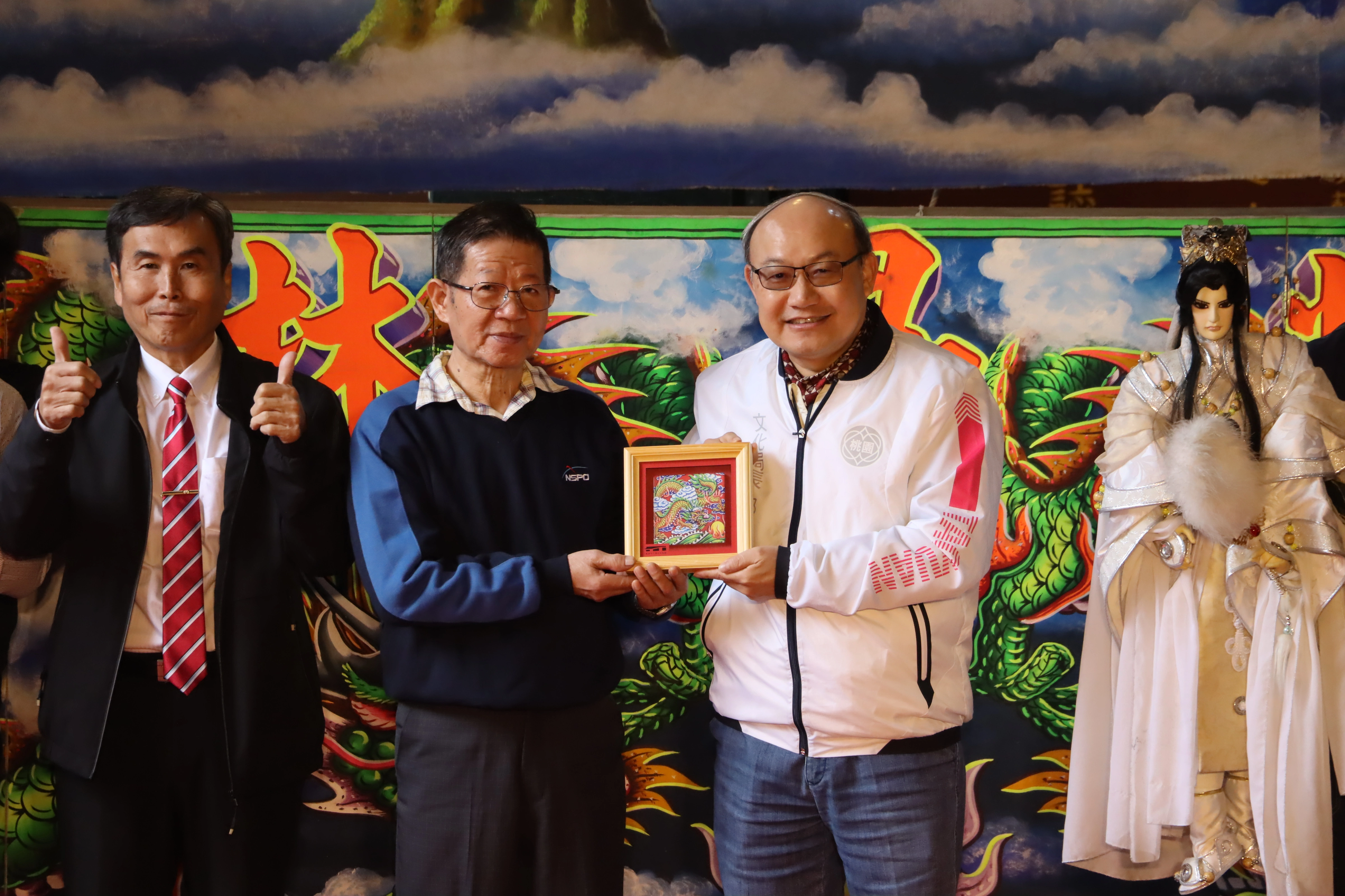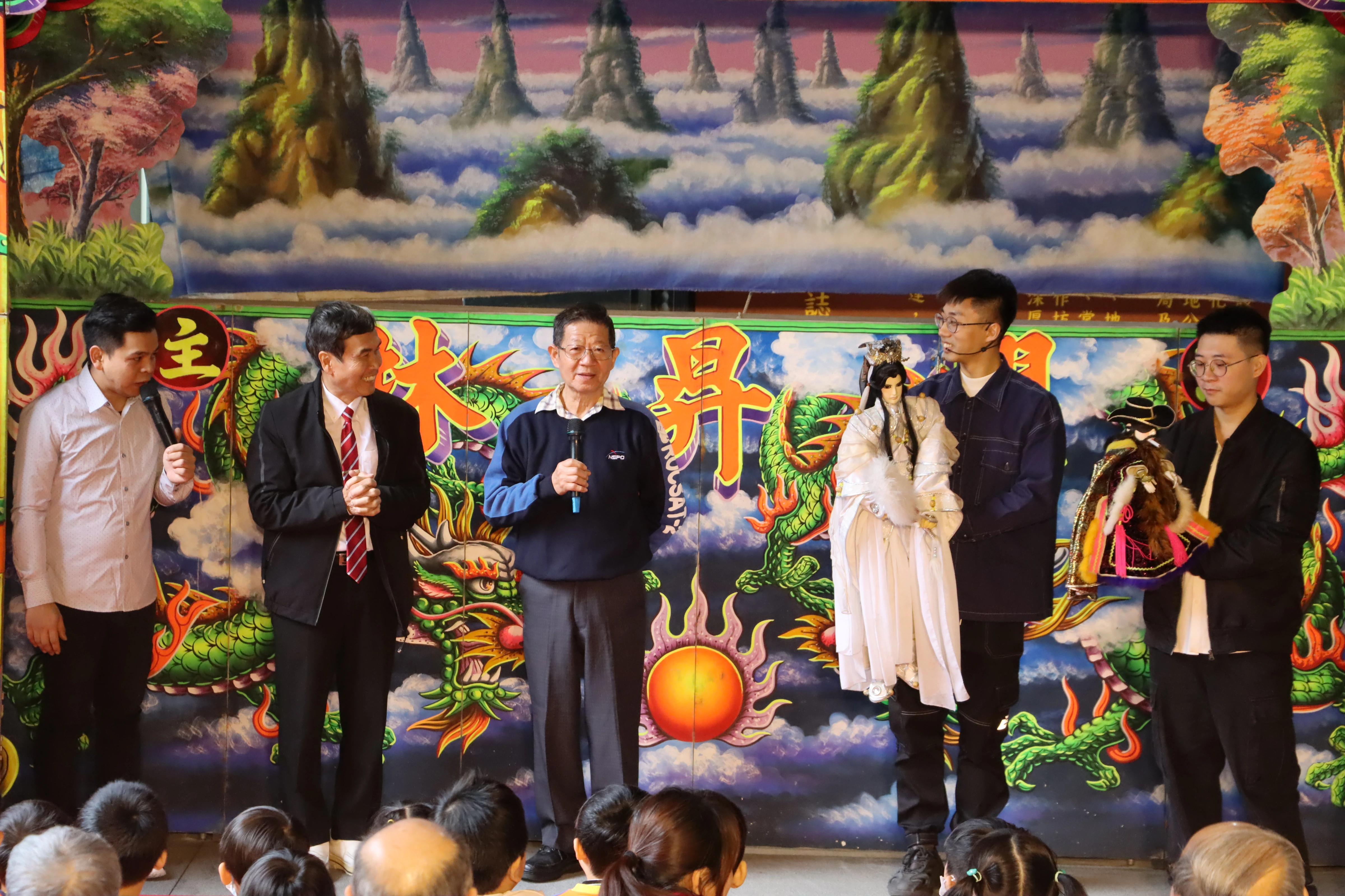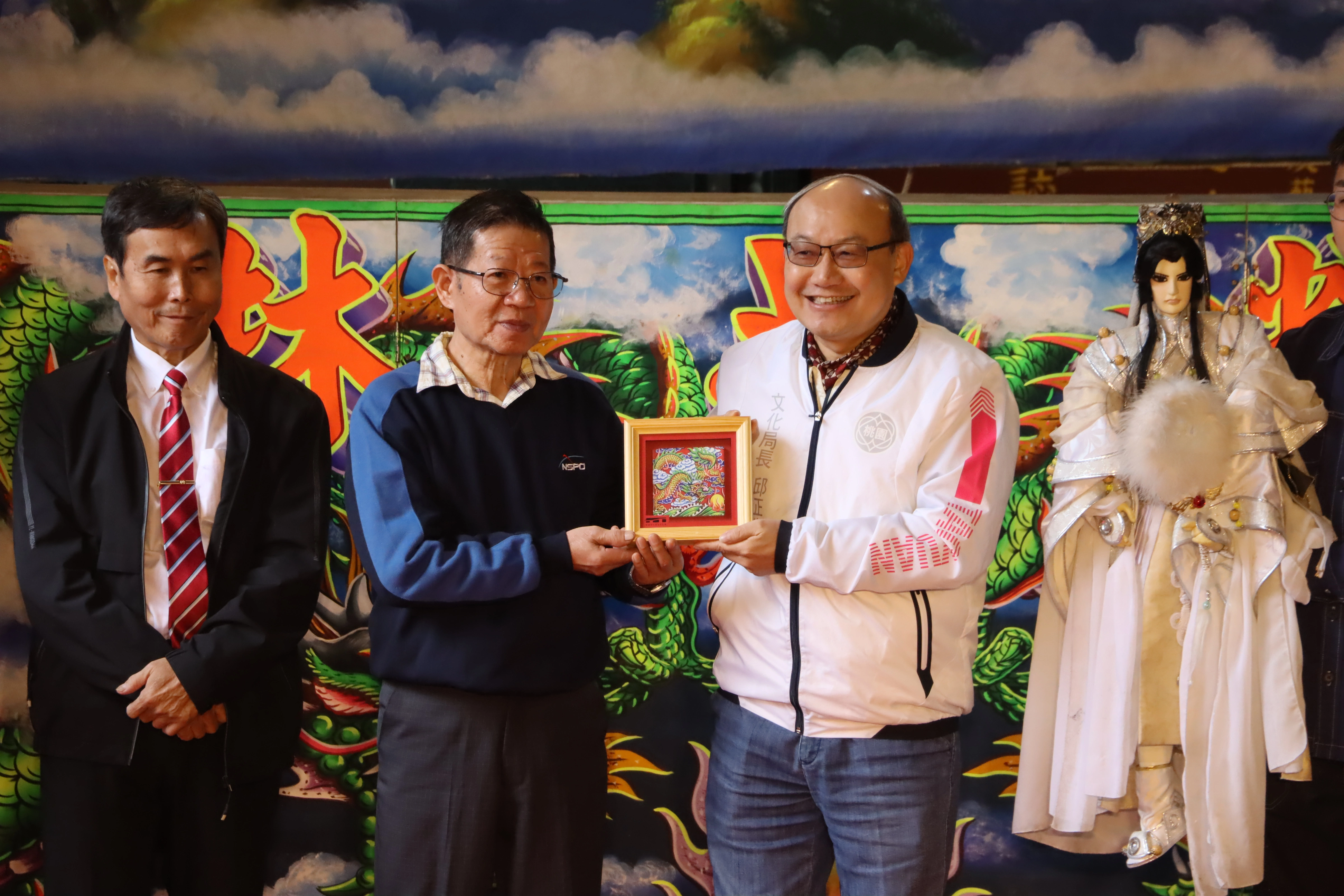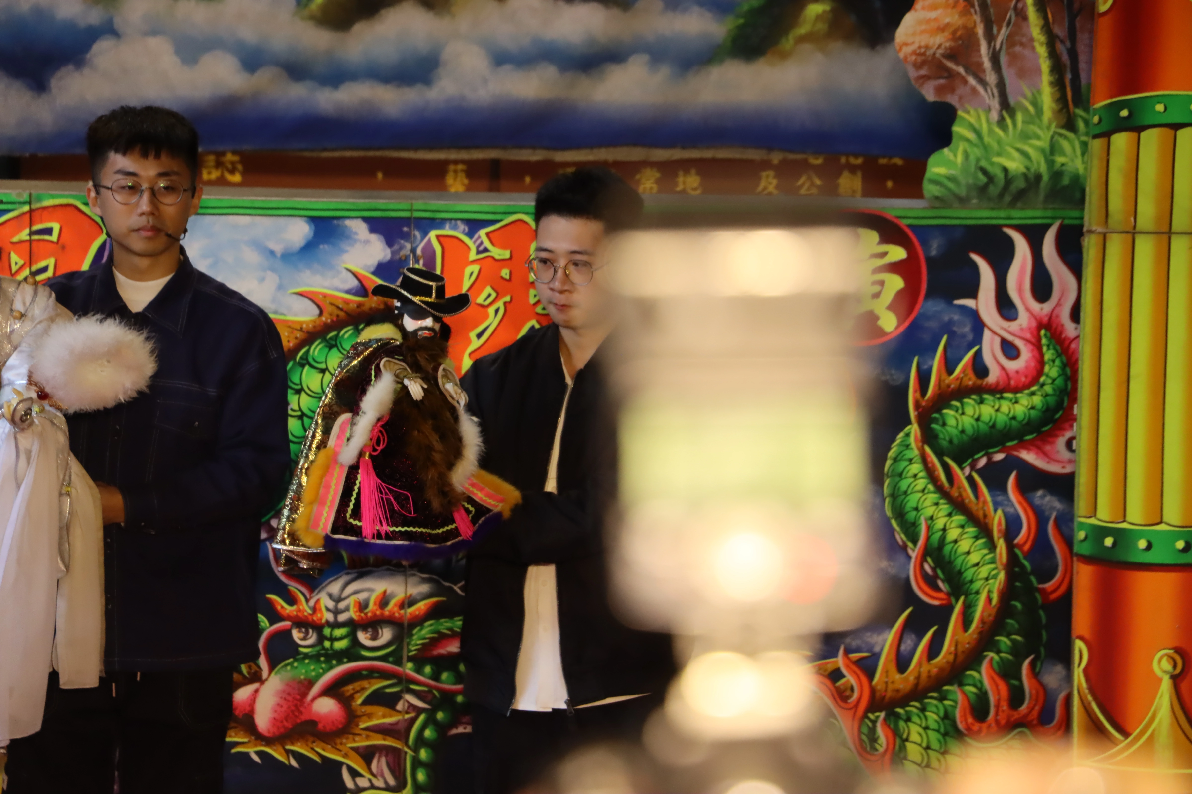 12/17下午兩點,在土地公文化館廟埕舉辦的盛大開幕記者會,邀請到隆興閣掌中劇團、泰興樂掌中藝術團、日日大掌中木偶劇團、新世界第五掌中劇團等四大劇團同台拚場,輩分最高的隆興閣掌中劇團廖昭堂團長壓軸口白請出明男師跟現場媒體說話,明男師靦腆說道:「佈景是劇團的門面,恰如其分的背後佈景更能襯托劇情的張力,在演師靈巧的指動中加上震撼力的口白,使觀眾的思緒完全被劇情所牽引,而佈景的製作,除了自己的靈感外,更要了解劇情的內涵,才能達到整體效果。」