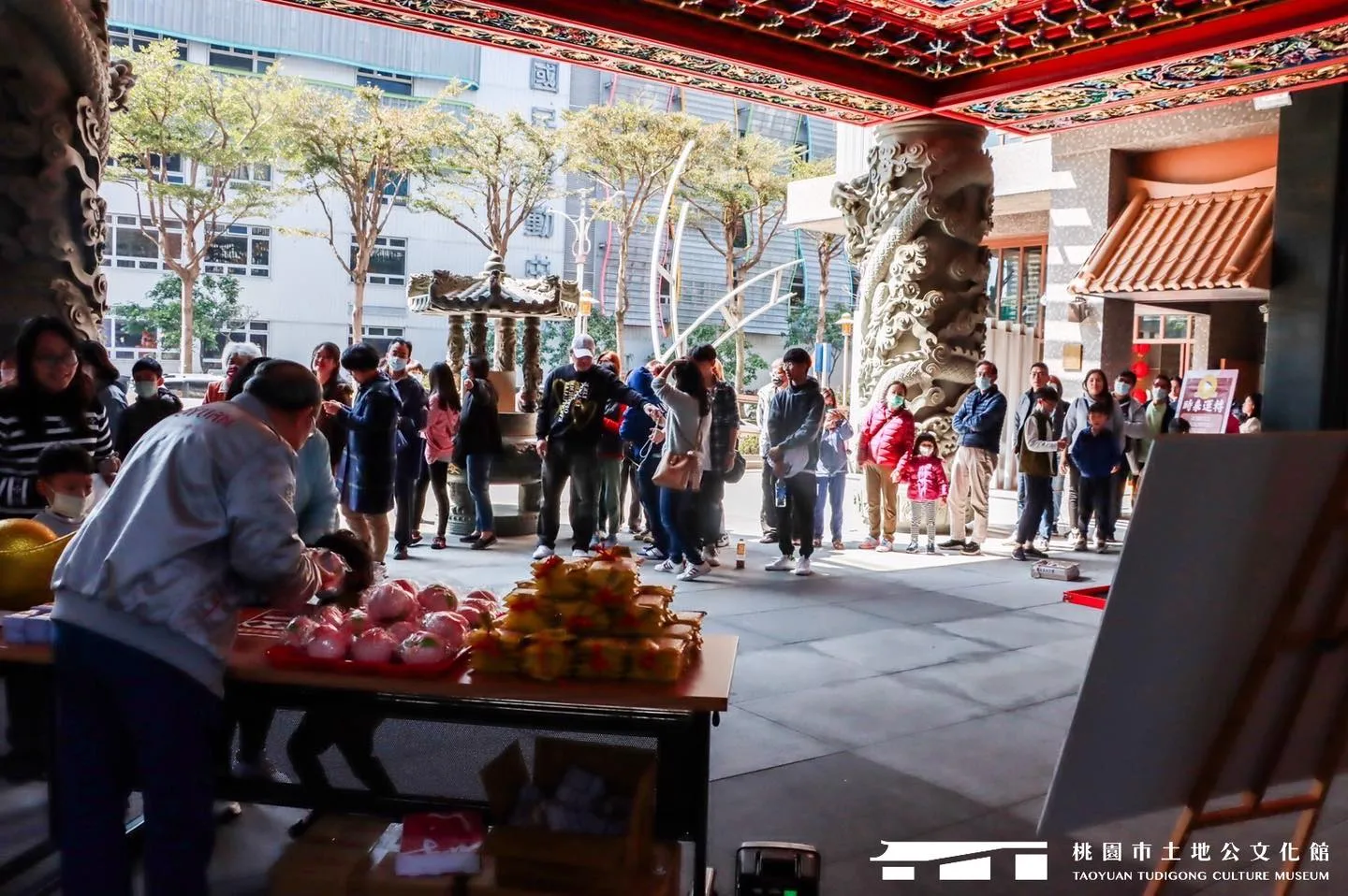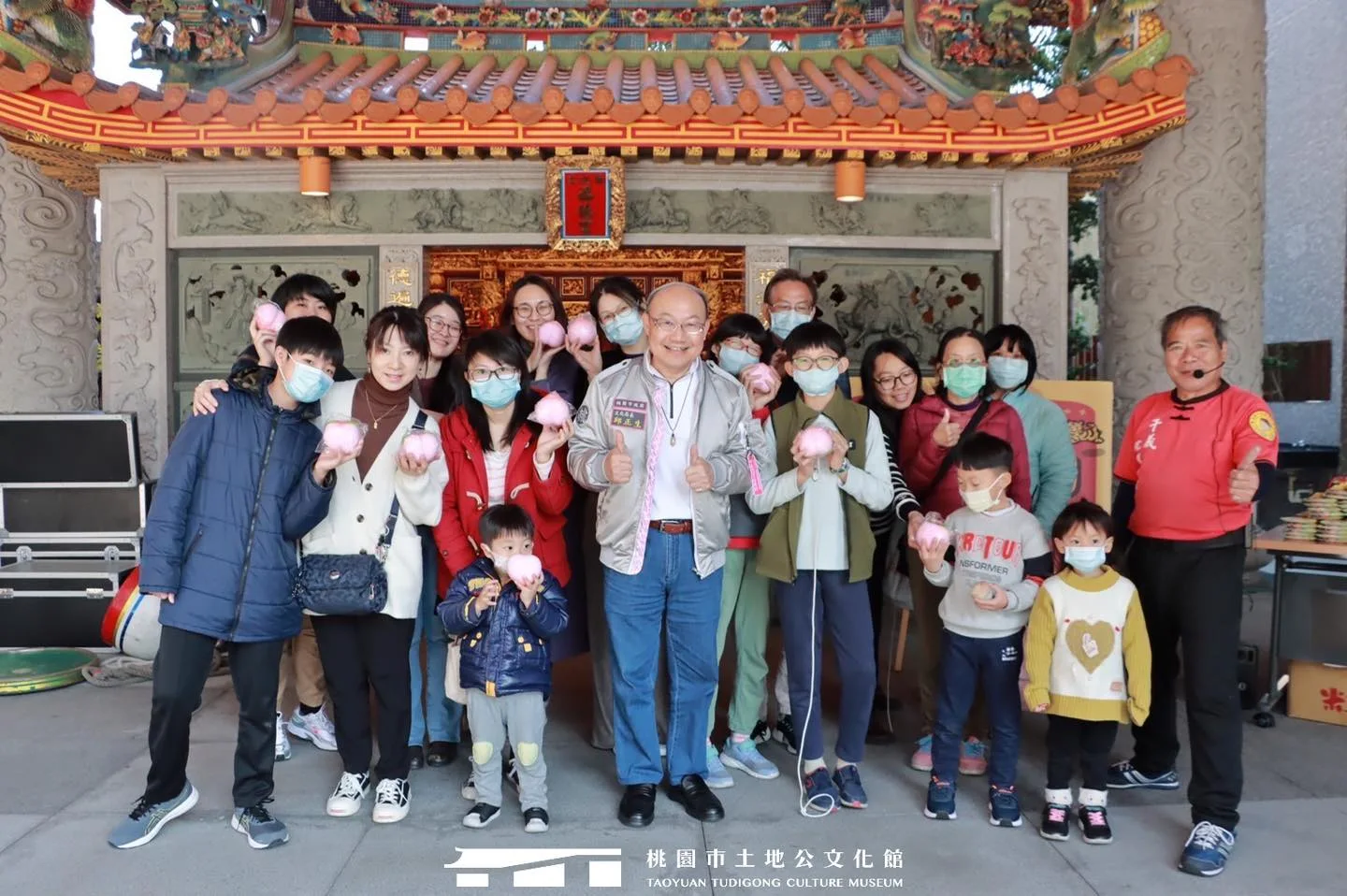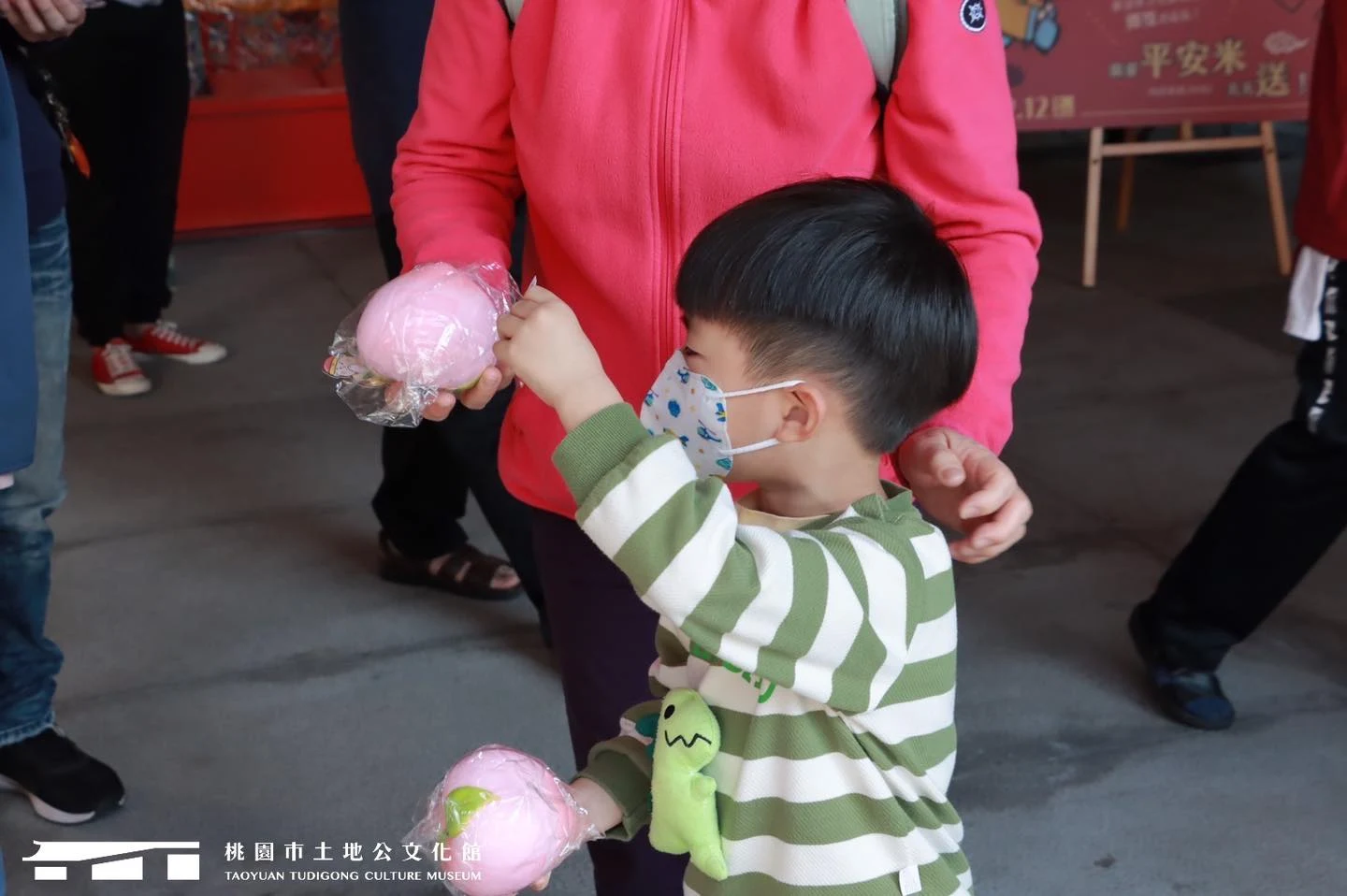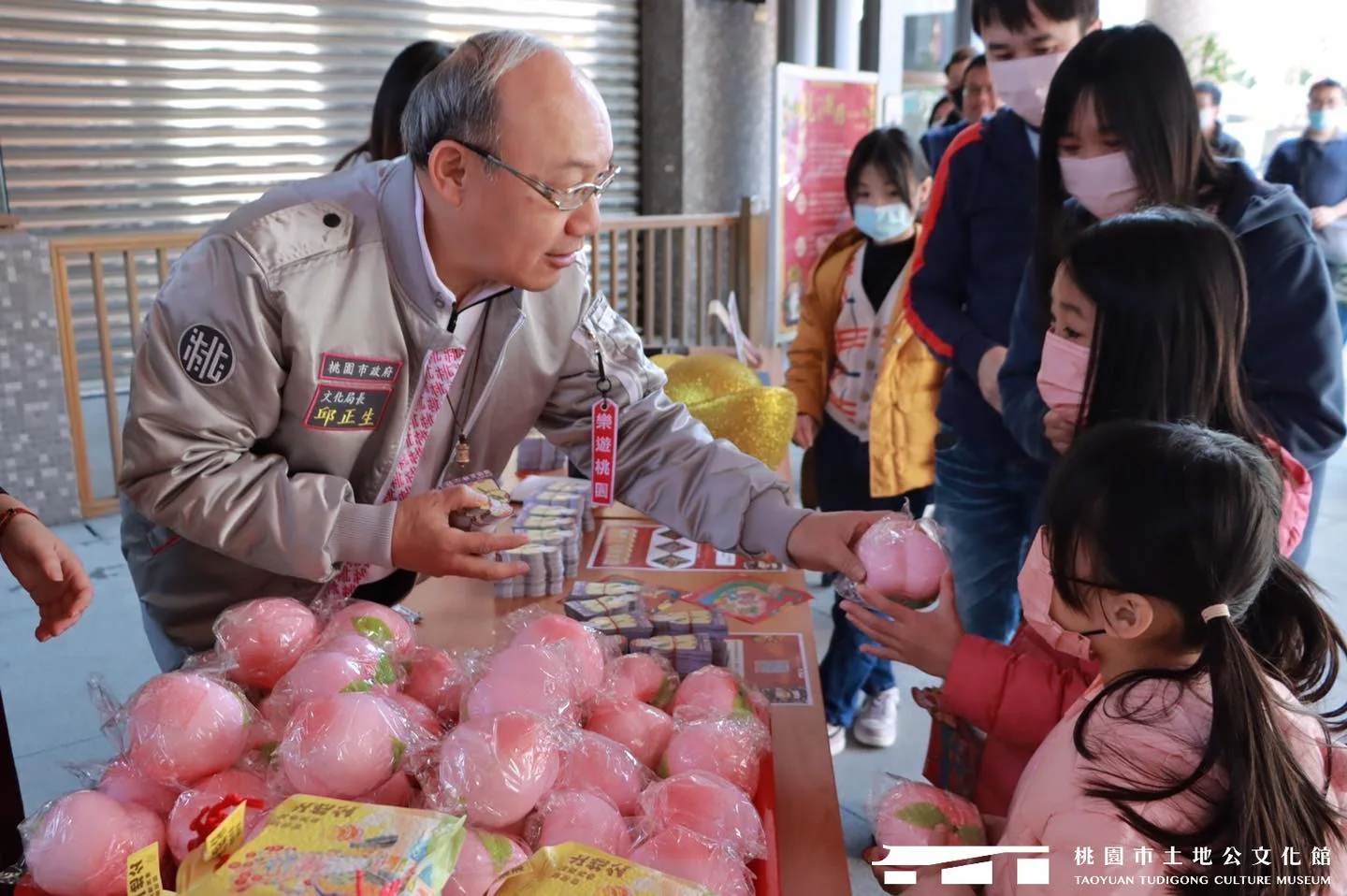 中午時,桃園市文化局邱正生局長更親臨現場,為2024年土地公平安卡過香火,並發送紓壓仙桃玩具,將新春滿滿的祝福分送給參與民眾。