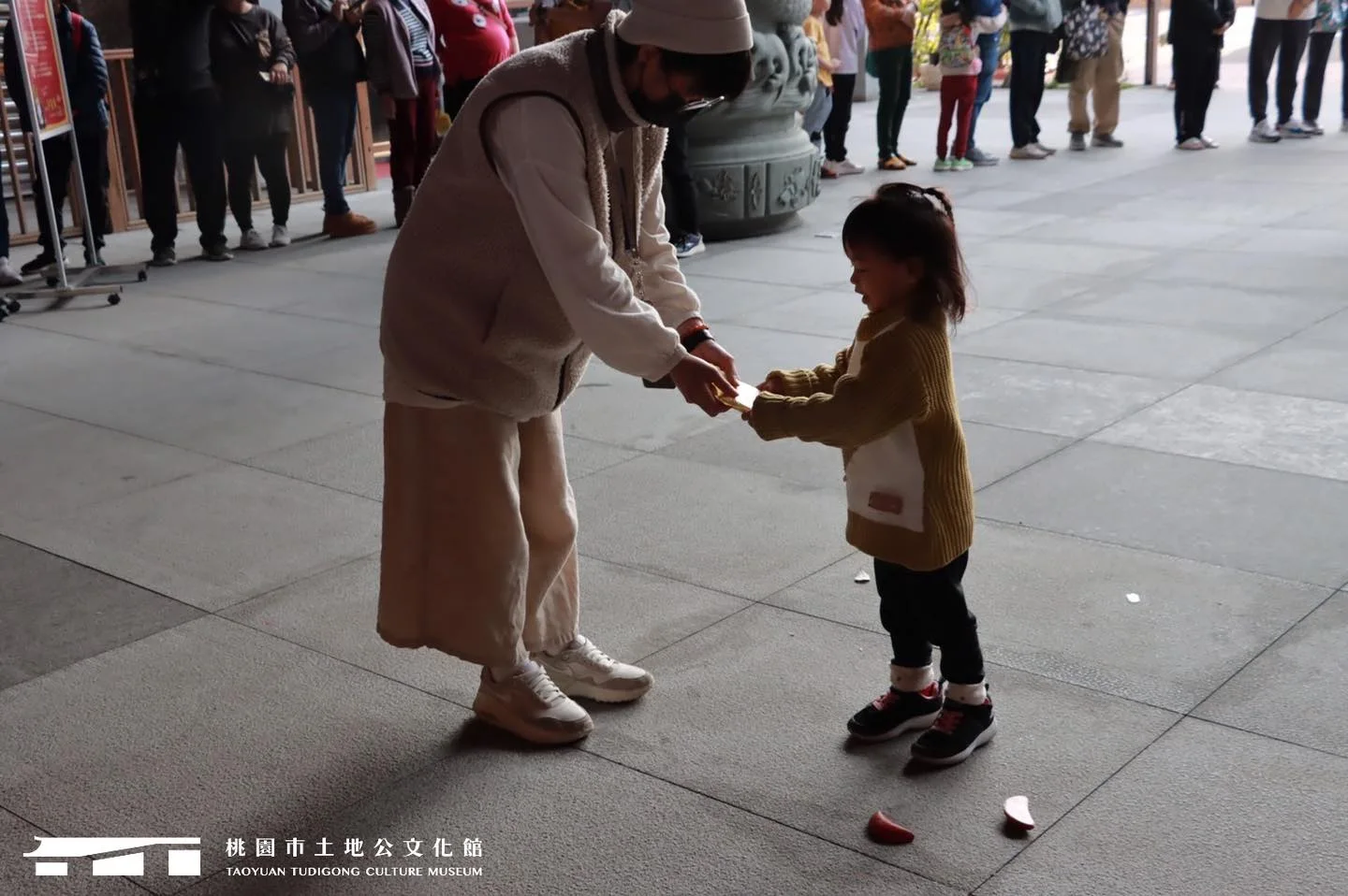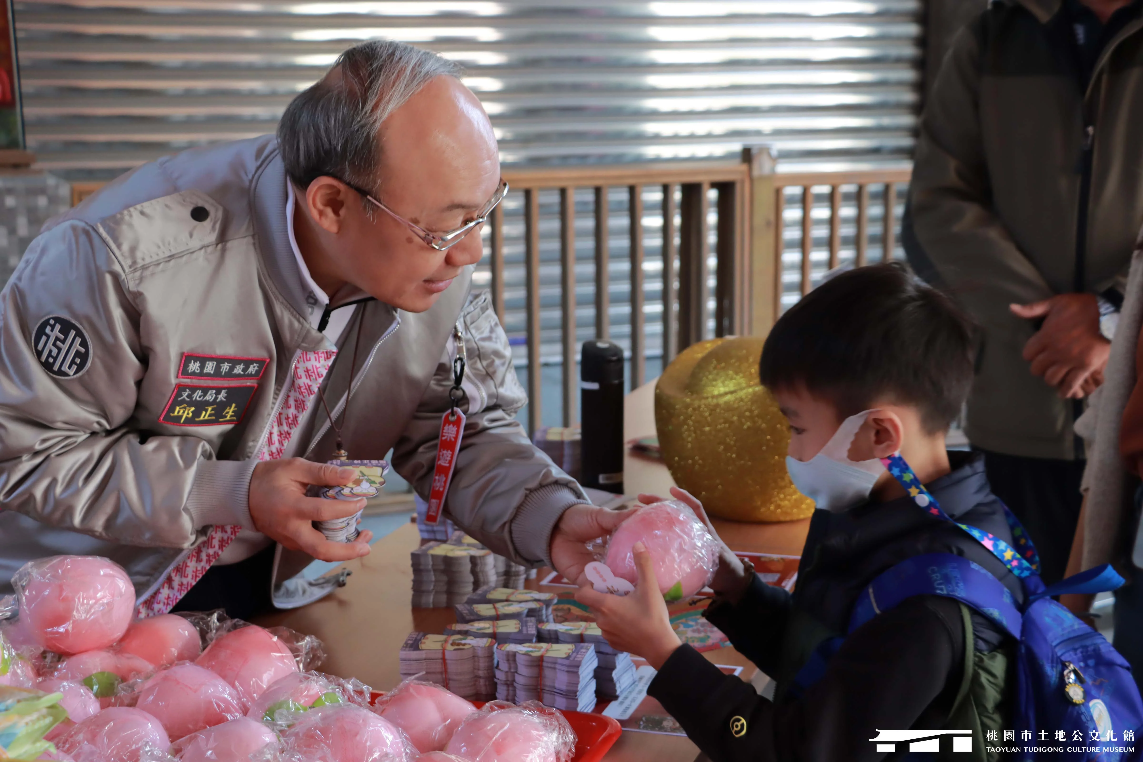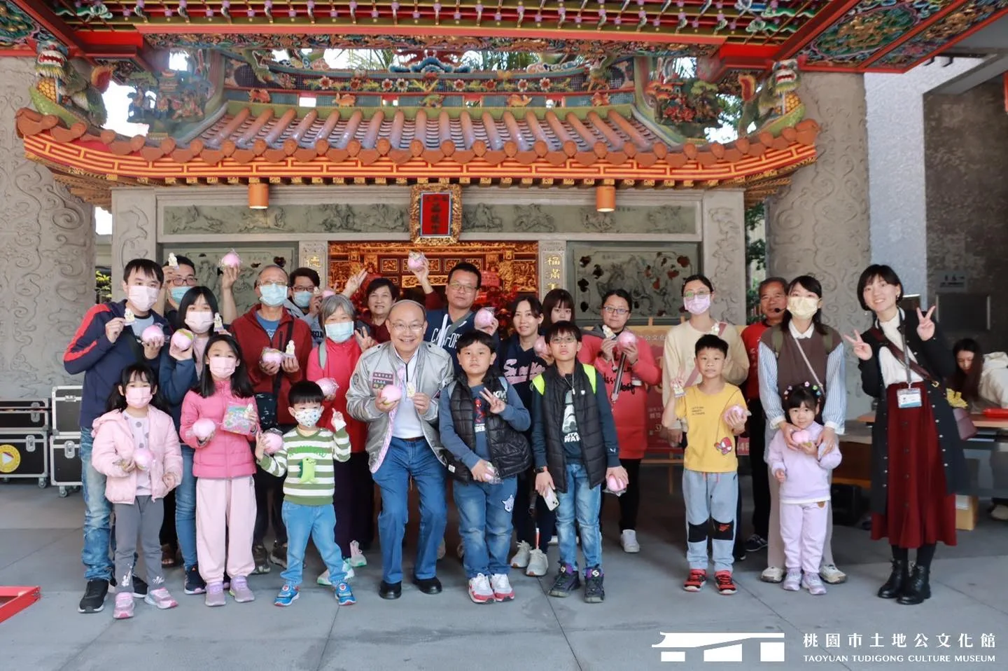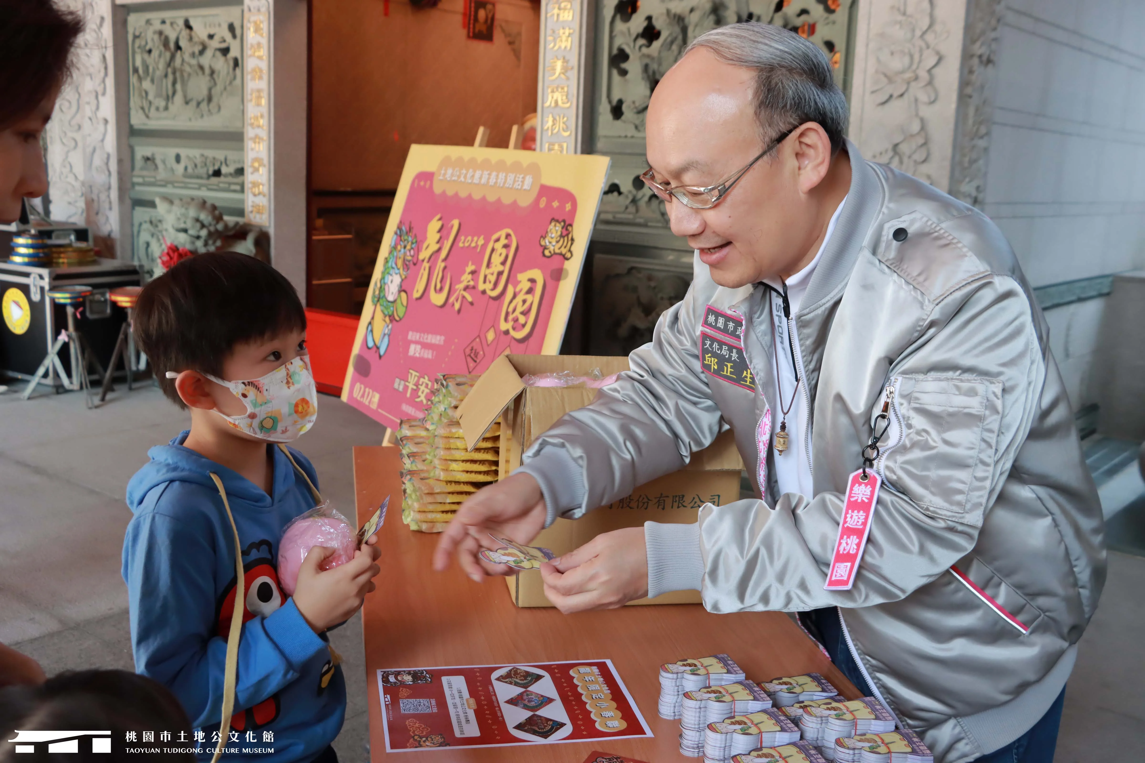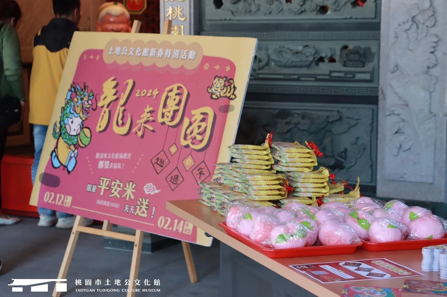 中午時,桃園市文化局邱正生局長更親臨現場,為2024年土地公平安卡過香火,並發送紓壓仙桃玩具,將新春滿滿的祝福分送給參與民眾。