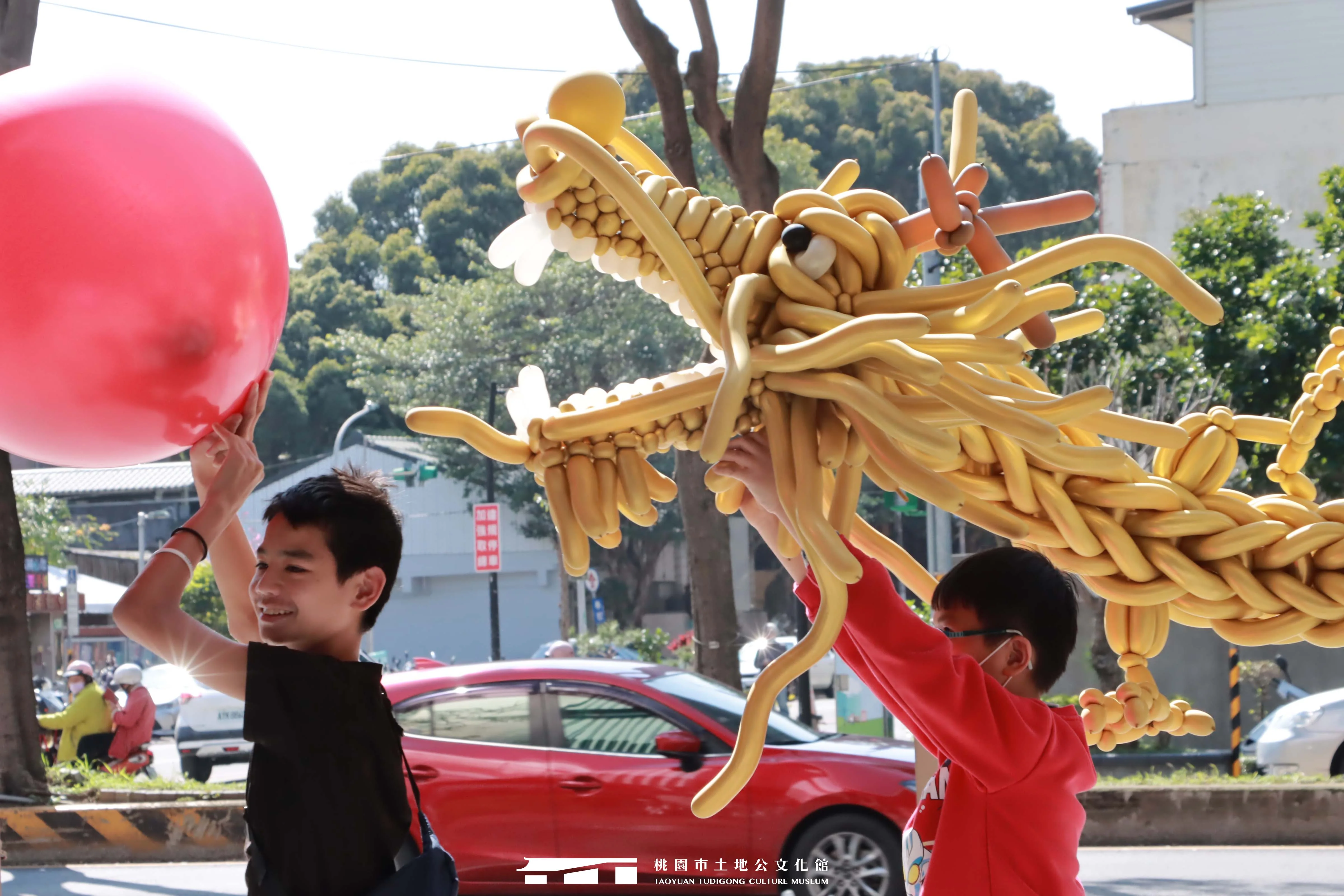 初五的豐富表演也讓土地公文化館充滿了歡笑聲,有魔術師林桓宇帶領觀眾一起踏入魔術的神秘世界,以及傑邑氣球帶來的「歡樂舞龍氣球秀」,大家一起高舉著氣球做的金龍,在廟埕玩得不亦樂乎呢!這天下午還有大獅姐姐帶來的有趣故事,和大家一起用簡單的材料,製作可愛的龍年小燈籠。