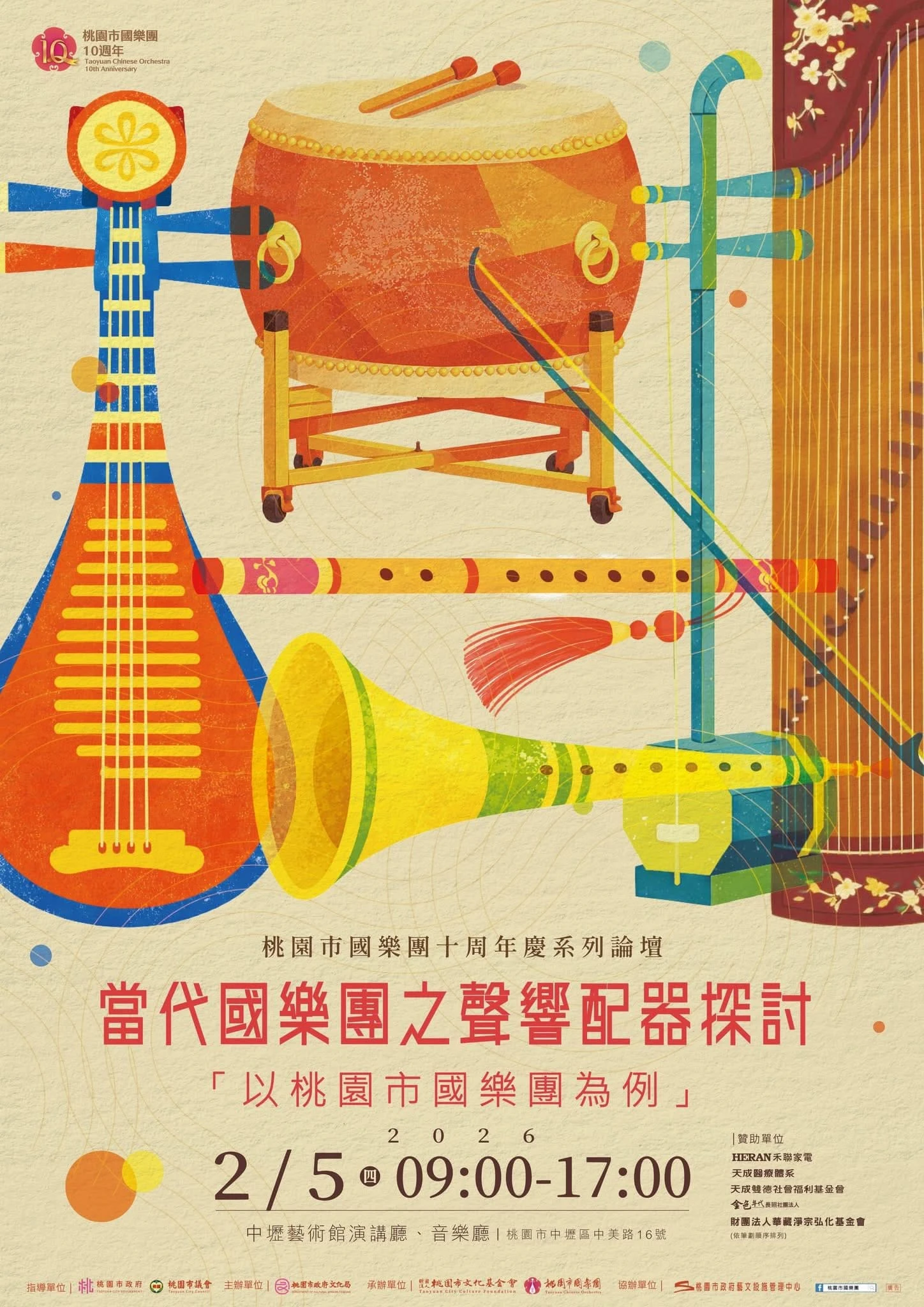 在臺灣現行多為「中小型編制」的國樂團條件下,該如何配置樂團編制,才能發揮最佳音響效果?作曲家在配器時,又如何兼顧樂器音域、音色層次與音量平衡? 本次座談會將以桃園市國樂團為實例以弦樂為主軸,邀集臺灣新生代指揮與作曲者,從「樂團實務」與「作曲配器」雙視角切入,透過經驗交流與現場樂團試奏,一同探討當代國樂聲響的多元可能性。