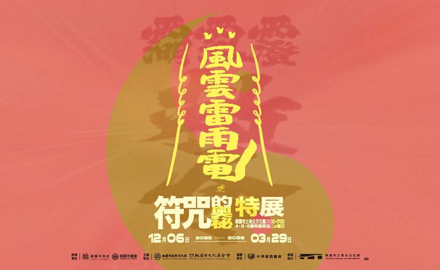 本次特展「風雲雷雨電──符咒的奧秘」,由堅強的學者專家顧問群指導,中華道教總會協辦,桃園市土地公文化館同仁策展,以「符咒」為主角,帶領觀者重新認識這些貼在門上、隨身攜帶的生活符碼,以符法隱含的自然象徵—「風、雲、雷、雨、電」為題,揭示符咒之秘。